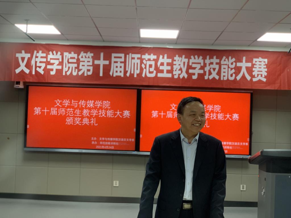 激动人心的颁奖环节结束后,院长杨运庚做总结发言。他首先对三位评委老师的精彩点评、组织大赛的老师和师范技能社同学的辛勤付出、初赛阶段全体教师的耐心指导、十二位选手的辛苦备赛表示了感谢。希望同学们借大赛之机充分认识到优秀教师的成长要脚踏实地不断进取的道理。同时希望获奖选手戒骄戒躁继续努力,争取在校赛省赛中取得优异成绩。