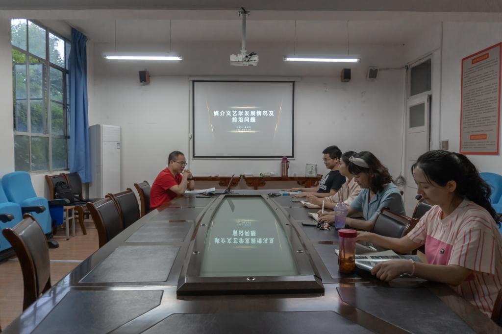 谭诗民首先介绍了当前国内外关于媒介文艺学研究的整体情况,指出媒介化生存既是当前我们现实生活普遍面临的问题,也是文学研究必然应对的挑战。接着他着重就媒介时代文艺批评的内在含义、关键特征、主要形态和核心问题等方面做了介绍和汇报。随后,与会教师分别当前媒介文学中的鬼畜视频现象、粉丝文化效应、参与式批评与创作、数字文艺评论治理等问题展开了热烈讨论。