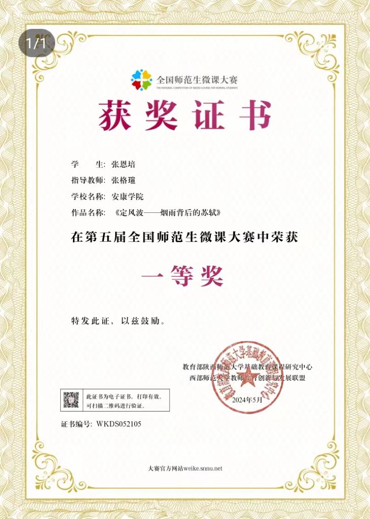近日,由教育部陕西师范大学基础教育课程研究中心、西北教师教育联盟主办的第五届全国师范生微课大赛获奖名单揭晓,澳门网投汉语言文学专业2021级1班张恩培同学在张格瑄老师的指导下荣获大赛一等奖。