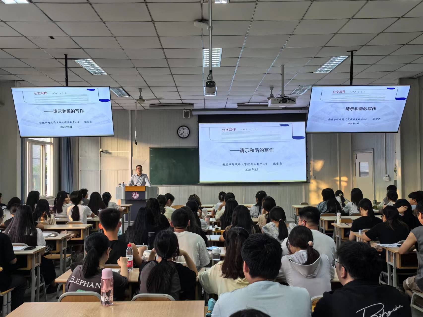 按照应用文写作“双师课程”教学计划,澳门网投唯一官网分别于5月21日、28日和6月4日、11日、14日邀请课程安康市政府采购中心张宏亮为汉语言文学2023级1、2班学生讲授请示、批复、报告、函、纪要等公文和申论写作的技巧。校内任课教师胡少山随堂参与了授课。