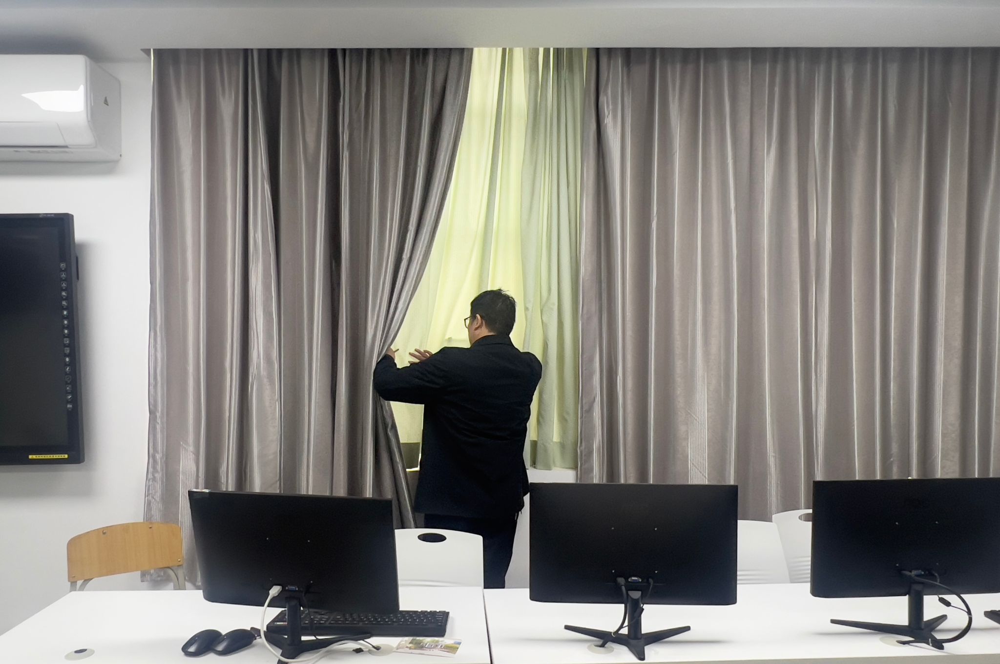 随后,检查小组围绕安全隐患排查展开细致核查。在电路安全方面,工作人员逐一检查了配电箱、电源线路、插座接口等关键部位,确认线路布局规范、接地保护可靠,无老化、破损及私拉乱接现象;在设备安全层面,对秘书综合实训室的办公设备、创意写作实训中心的计算机终端、新媒体虚拟演播实训室的摄像设备、灯光系统、直播控制台等进行检查,查看设备运行状态是否稳定,操作流程是否符合安全标准;此外,检查小组还对各实训室的门窗、消防器材、应急通道等进行全面检查,确保门窗关闭灵活、锁具完好,消防设施配备齐全且在有效期内,应急通道畅通无阻。