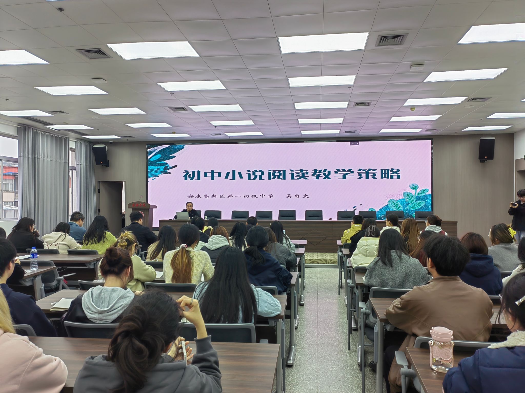 2025年11月12日下午1620分,澳门网投唯一官网于图书馆六楼报告厅举办第五届“中学语文卓越师资班”第二讲。本次讲座特邀安康市高新区第一初级中学副校长、陕西省优秀教学能手陕西省学科带头人吴自文老师,作题为《初中小说阅读教学策略》的专题分享。班主任唐明珍与师资班全体学员聆听本场讲座