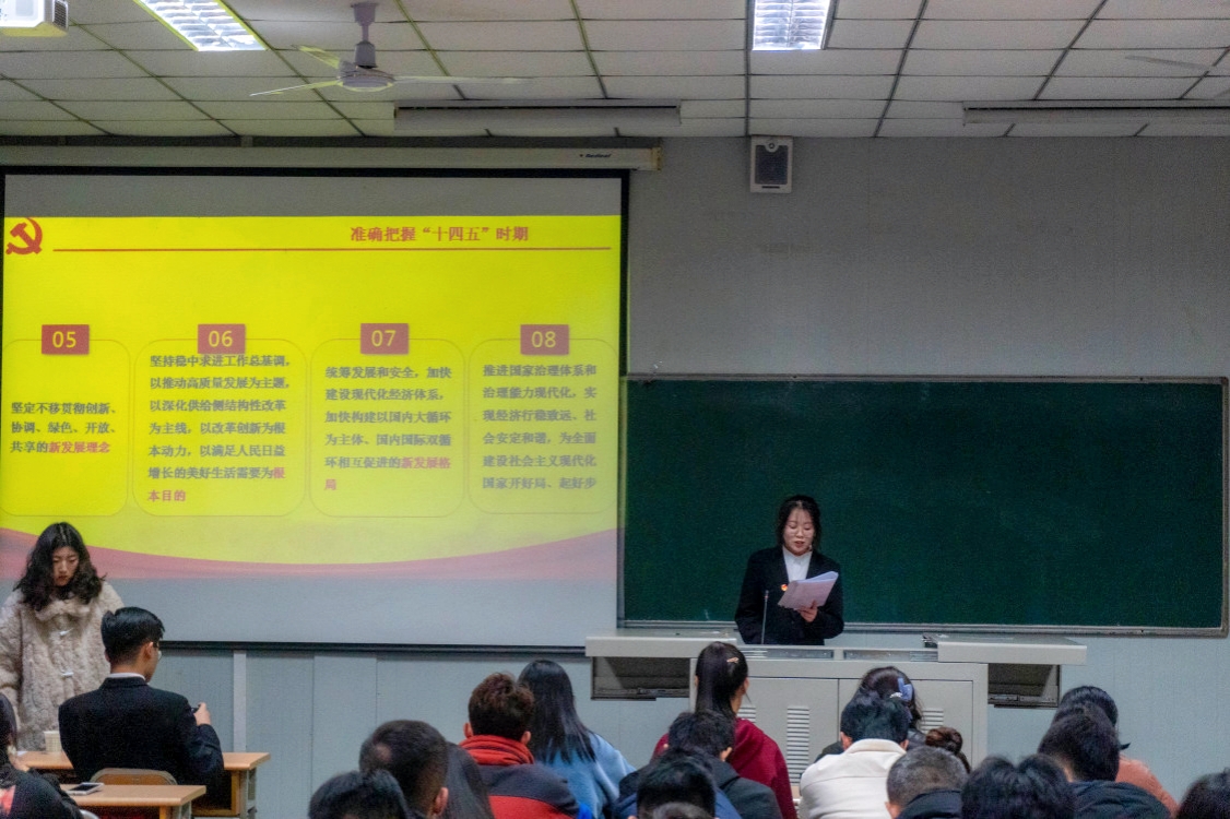 党的十九届五中全会擘画了我国未来发展的宏伟蓝图,作出了应对变局、开辟新局的顶层设计,在党和国家发展进程中具有全局性、历史性意义。宏伟蓝图鼓舞人心,学习宣讲凝聚力量。为全面落实党的第十九届五中全会精神,由学工部、马克思主义学院主办,澳门网投唯一官网协办的十九届五中全会宣讲活动于12月23日在江南校区10号教学楼1012室举办。澳门网投唯一官网党支部副书记杨海蓉、澳门网投唯一官网学生宣讲团成员、澳门网投唯一官网全体团学干部参加本次宣讲活动。活动由杨海蓉主持。