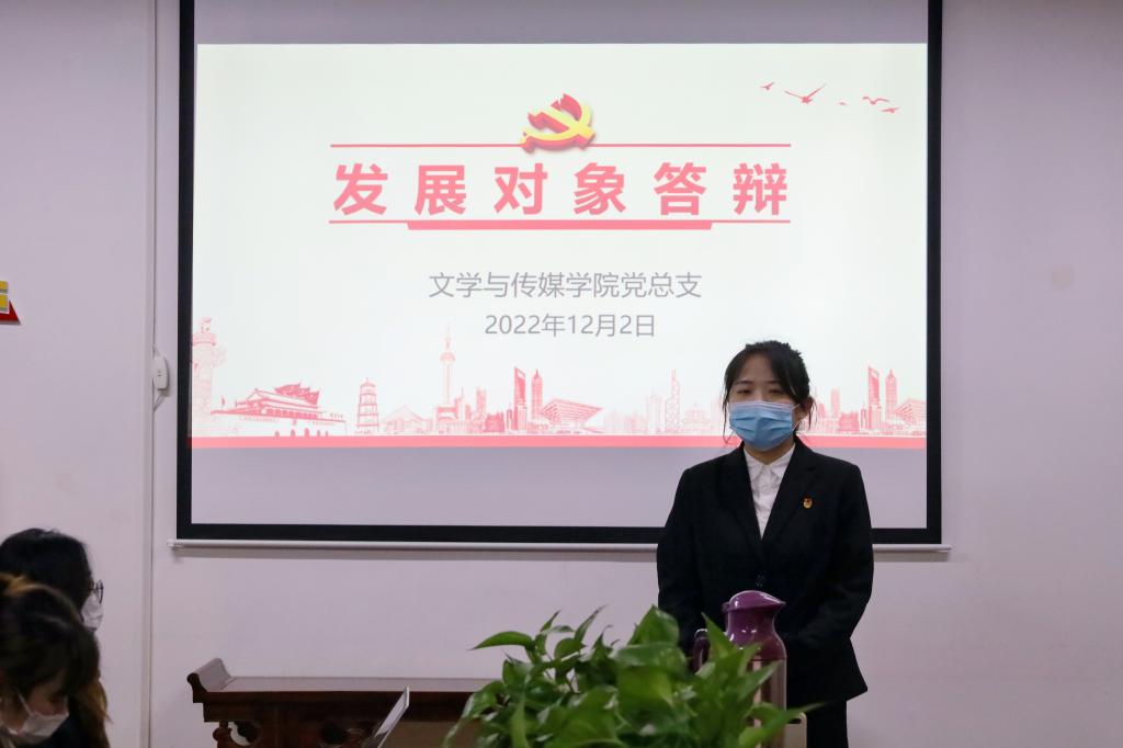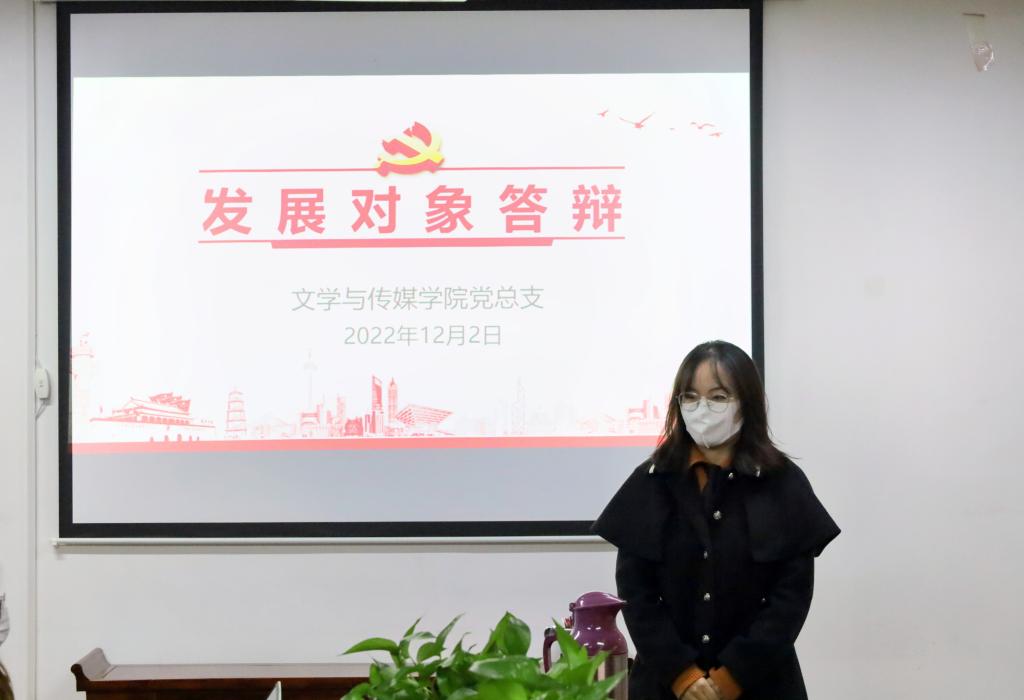为深入学习宣传贯彻党的二十大精神,规范党员发展工作,引导入党积极分子树立共产主义远大理想,同时严格把控党员发展质量,考察发展对象的党性修养,吸纳具备较高政治思想意识和党性觉悟青年学生加入党组织,澳门网投唯一官网学生党支部于2022年12月2日晚19:00在2307会议室举行2022年下半年发展对象答辩会。受疫情影响,此次答辩会采用线上与线下相结合方式进行。澳门网投唯一官网党总支副书记杨海蓉、团总支书记彭潇、学生党支部书记李欣逸、薛涛出席了本次答辩会。