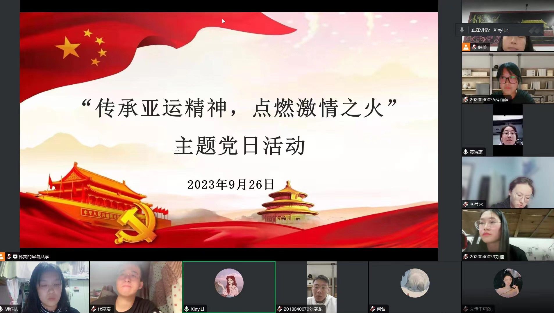 9月26日晚,澳门网投唯一官网学生第一党支部召开了“传承亚运精神,点燃激情之火”特色主题党日活动。本次活动由澳门网投唯一官网第一党支部书记李欣逸主持,支部全体党员参会。