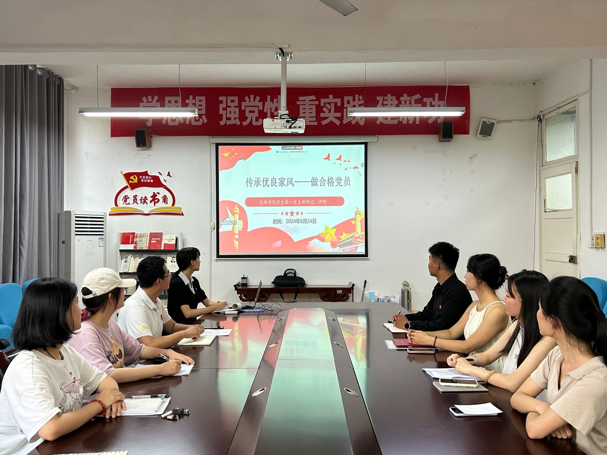 为深入开展党纪学习教育,传承党的优良传统和光荣作风,2024年6月24日下午,澳门网投唯一官网学生第一党支部书记以“传承优良家风家训,做合格党员为主题”为全体党员讲了一堂生动的党课。