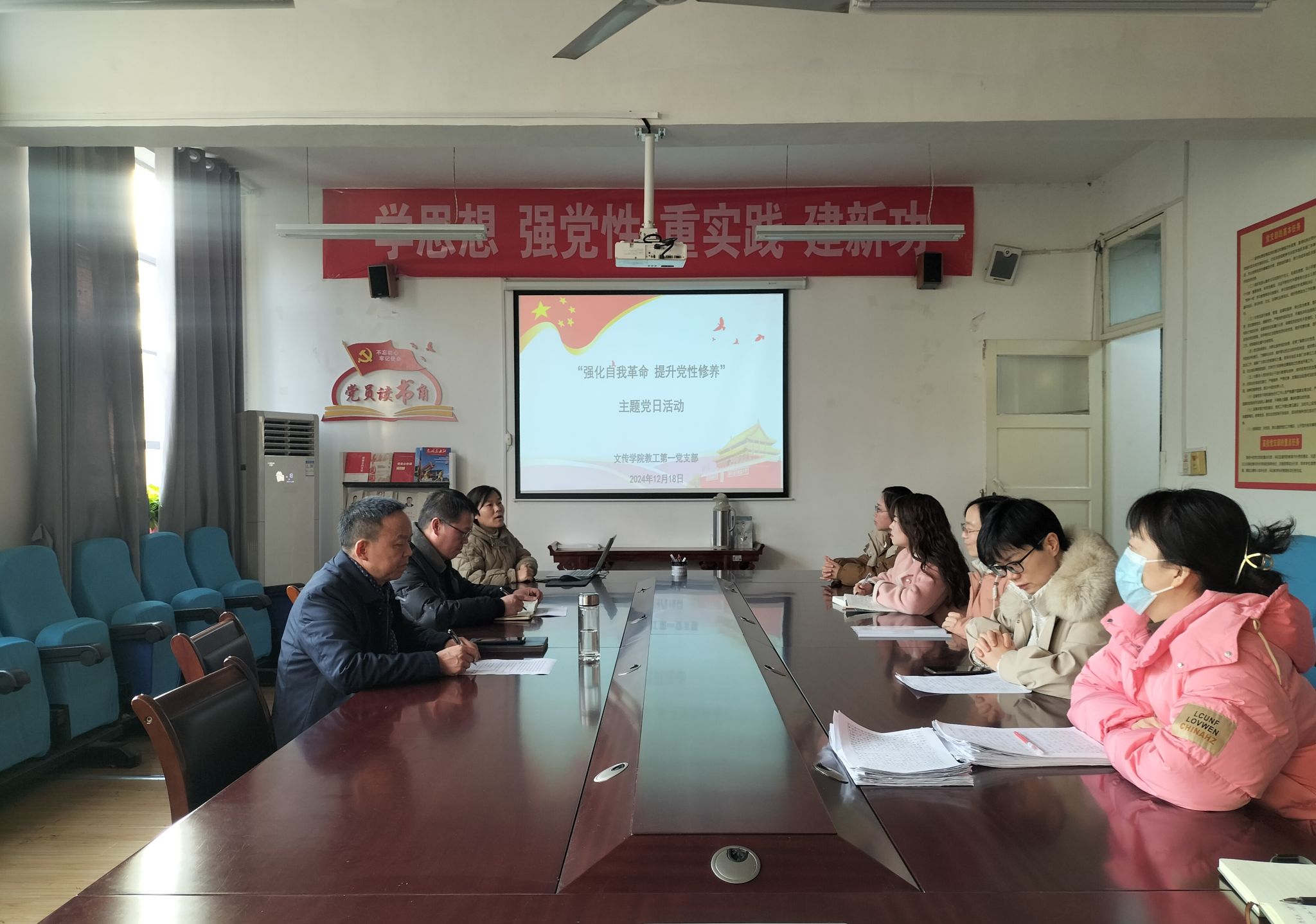 为进一步学习和理解习近平总书记的《深入推进党的自我革命》精神内涵,2024年12月18日下午,澳门网投唯一官网教工第一支部组织全体党员开展“强化自我革命 提升党性修养”主题党日活动,活动由支部书记韩文霞主持。