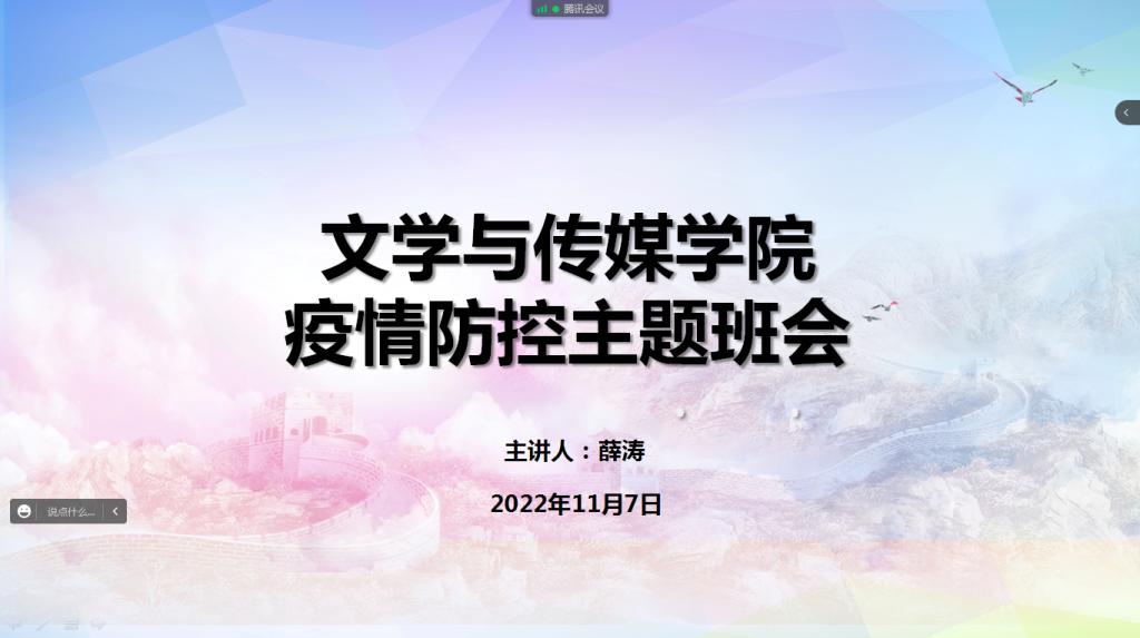 鉴于当前疫情呈现多点散发、局部爆发态势,为更好地引导学生配合做好当前学校疫情防控工作,确保师生生命安全、身体健康和校园稳定,筑牢学生安全防范思想防线,澳门网投唯一官网各年级于11月7日通过线上、线下结合的形式组织开展疫情防控安全教育专题班会,班会由各年级辅导员主持,全体学生参会聆听。