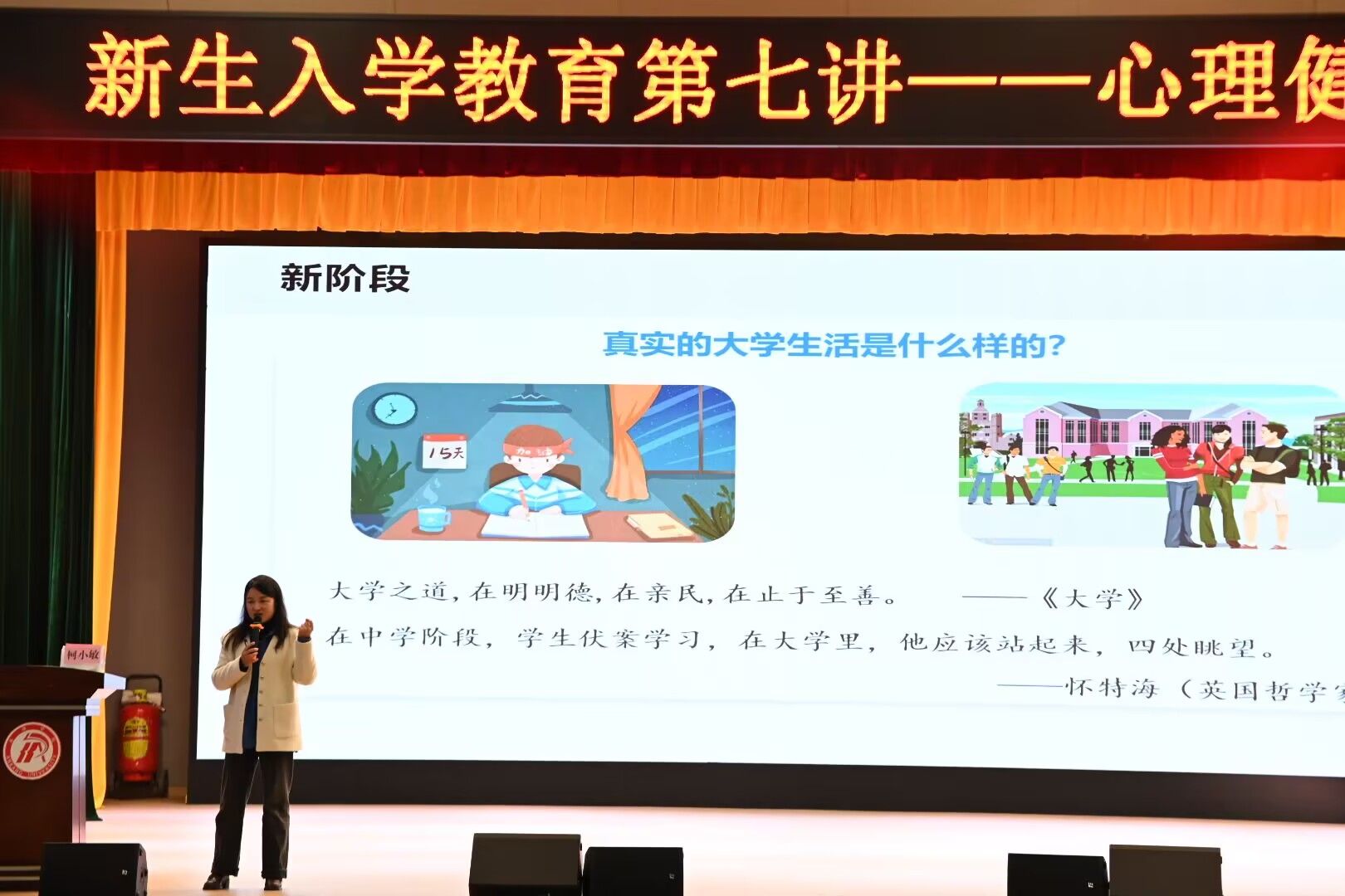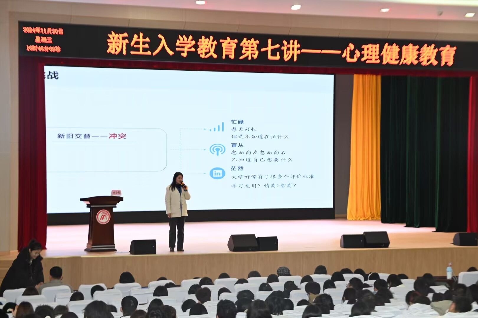 为进一步提升大学生心理健康素质,帮助同学们更好的应对挫折与挑战,11月20日下午,澳门网投唯一官网在江南校区大礼堂开展了大学生心理健康教育专题讲座,特邀大学生心理健康教育中心主任柯小敏主讲。2024级全体新生参加活动,讲座由辅导员刘言军主持。