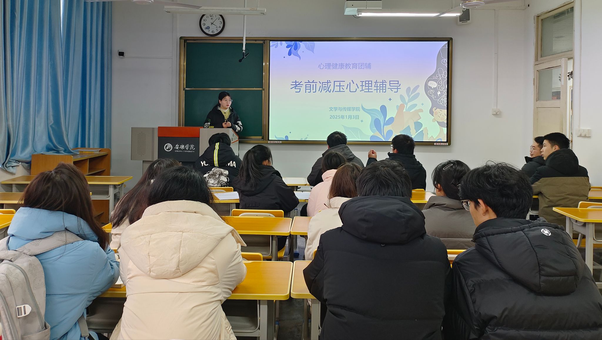 辅导员喻言、刘言军结合实际案例,深入浅出地讲解了焦虑情绪产生的原因、表现以及排解焦虑的应对方法。通过现场互动和问答环节,引导同学们正视自己的心理状态,学会主动调节情绪。