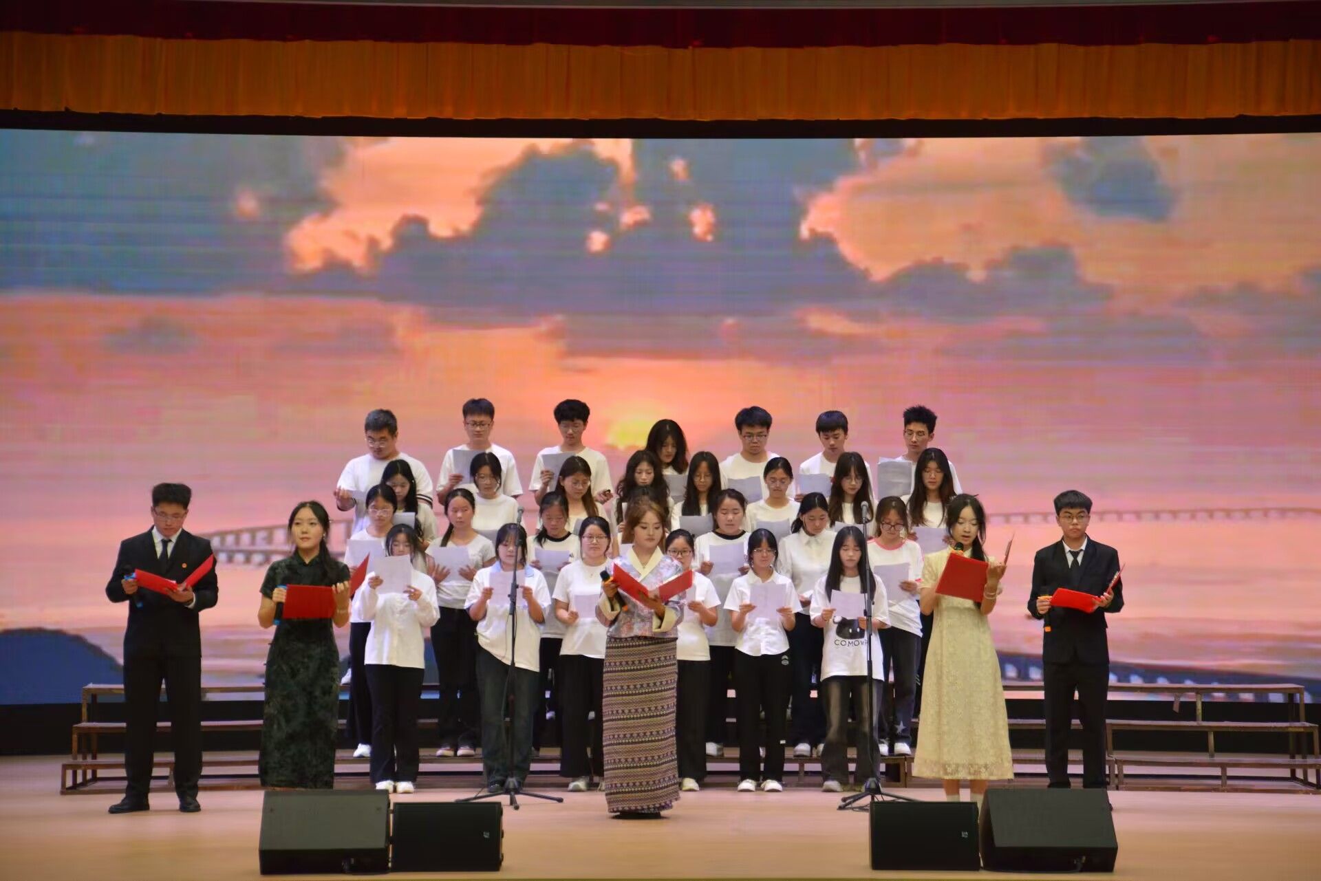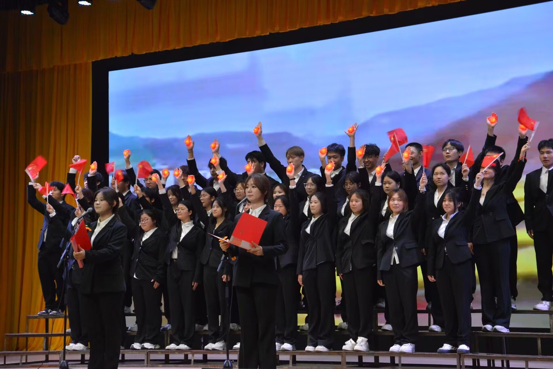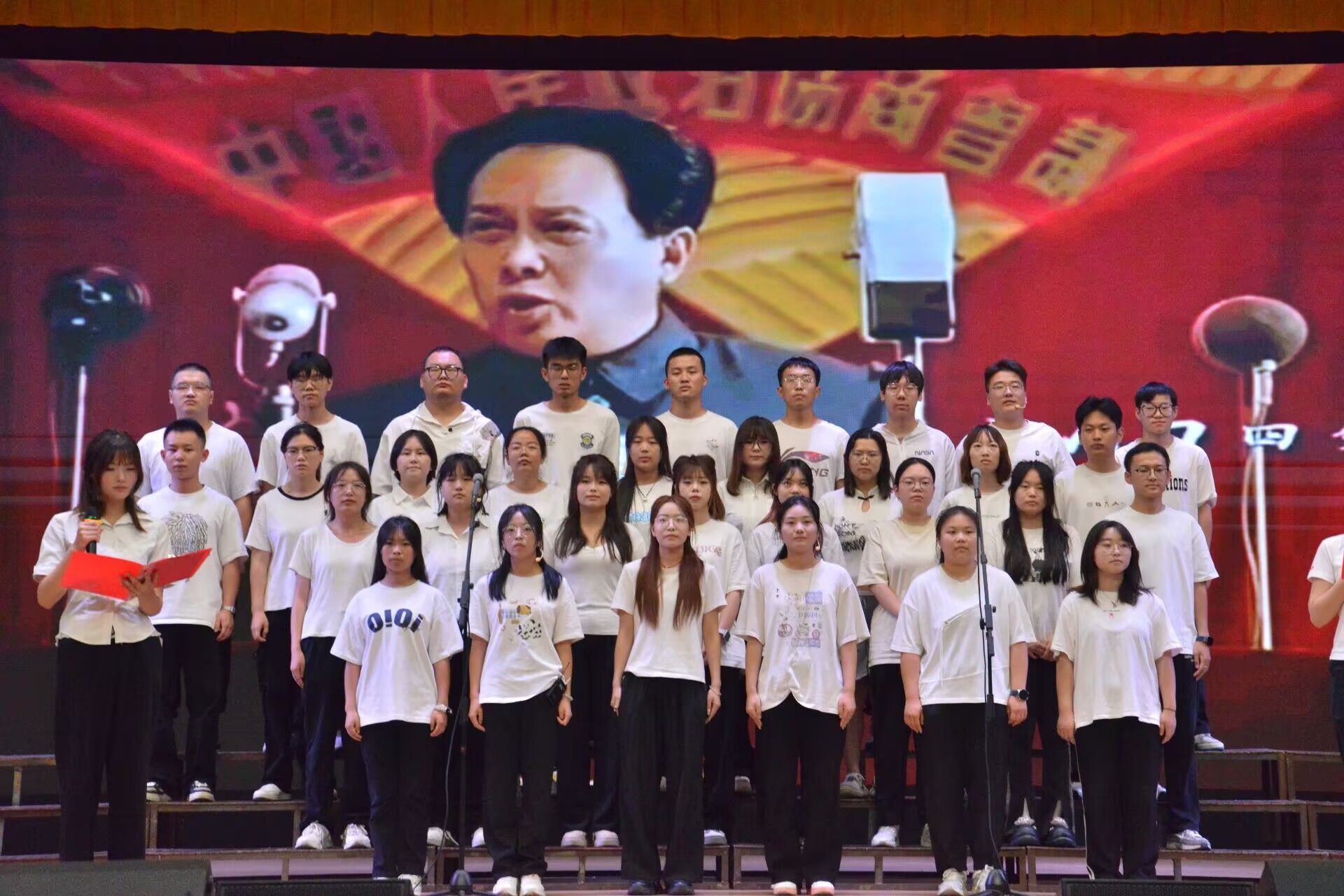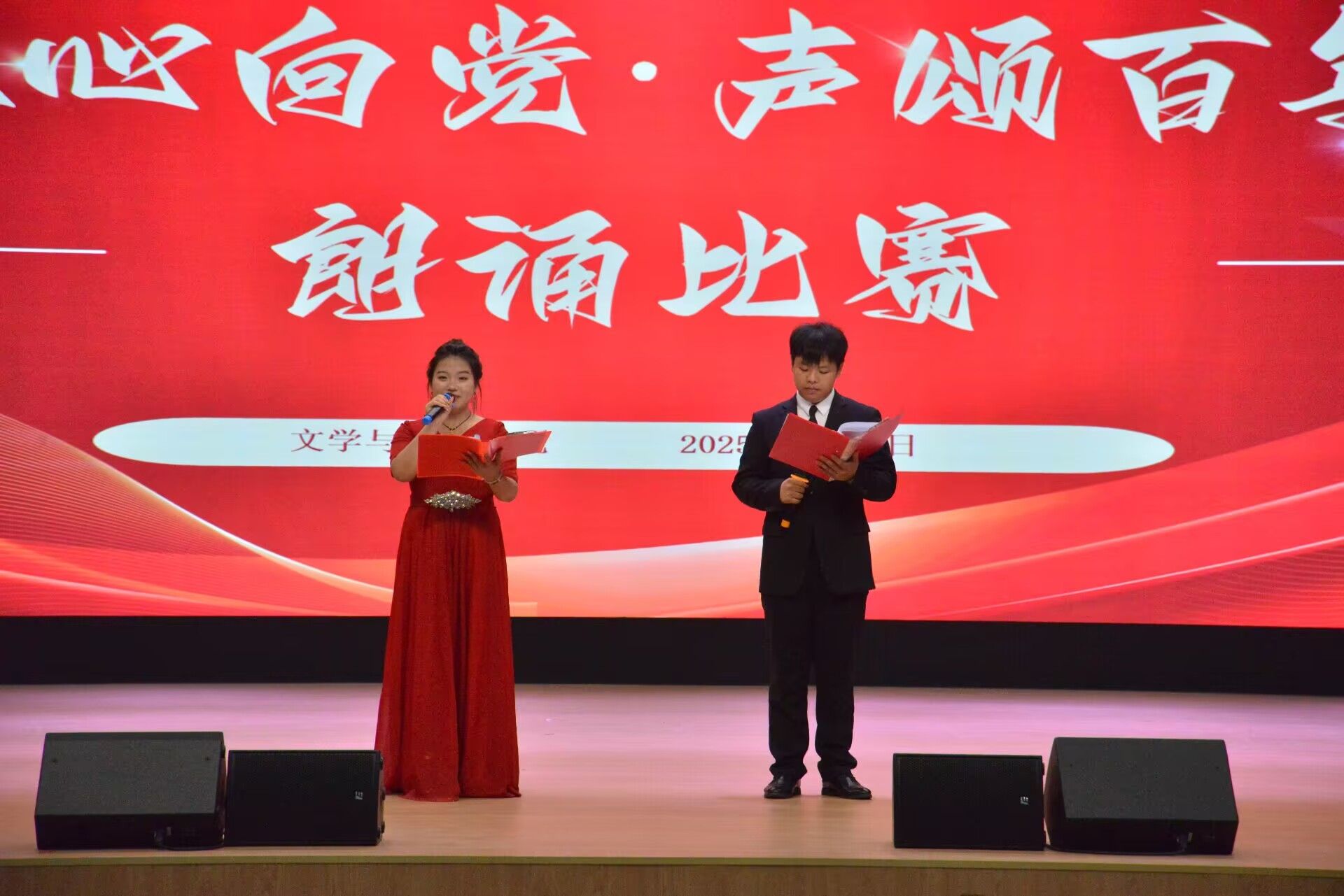 伴随着慷慨激昂的开场致辞,朗诵比赛在热烈的氛围中缓缓拉开帷幕。各参赛队伍用声音传递对党的忠诚与热爱,用朗诵缅怀先烈的丰功伟绩,用情感抒发新时代青年的责任与担当,并融入背景音乐、历史影像等创意形式,让经典焕发时代新意,为观众呈现了一场视听与情感交融的文化盛宴。他们有的深情婉转诉说历史记忆,回溯抗日战争中革命先烈的英勇壮举,生动诠释中国共产党团结带领人民抵御外侮、矢志奋斗的光辉历程;有的慷慨激昂演绎家国情怀,在抑扬顿挫的诗行里触摸山河的脉络,诉说百年征程里的青春豪情和少年担当,展现青春与信仰碰撞出的炽热力量。饱含深情的诵读、细腻动人的表达,既传递了中华文化的深厚底蕴,也展现了当代青年的文化自信与使命担当,让观众沉浸式感受革命先辈的精神力量。现场掌声此起彼伏,反响热烈。