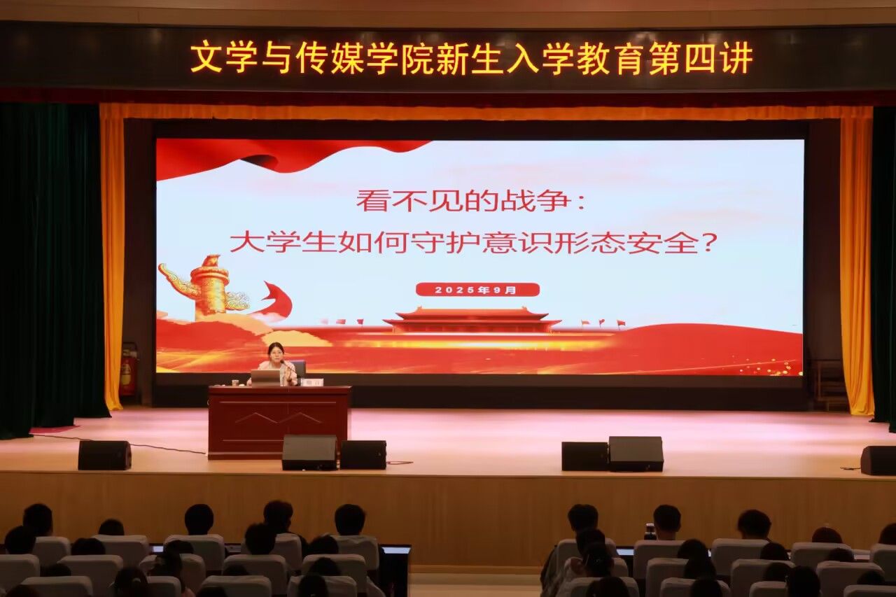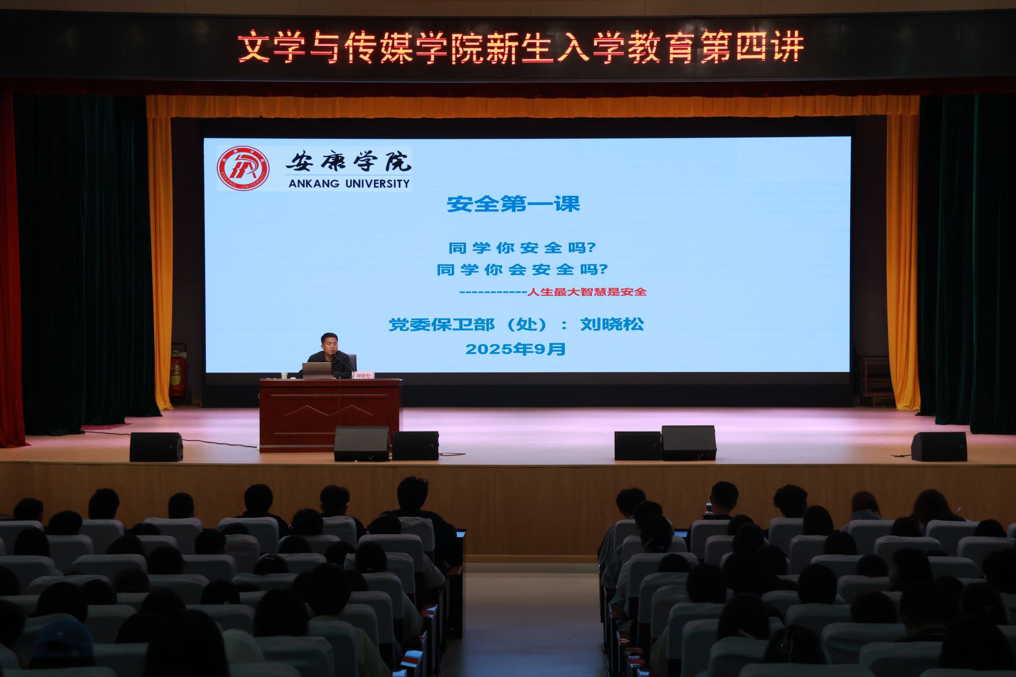 9月29日,澳门网投唯一官网在江南校区大礼堂开展新生入学教育第四讲。本次讲座旨在增强学生安全防范意识,提高自我保护能力,邀请学校党委保卫部综合科(政保科)科长、国家安全教育教研室主任刘晓松老师主讲,辅导员喻言主持,全体2025级新生参与。