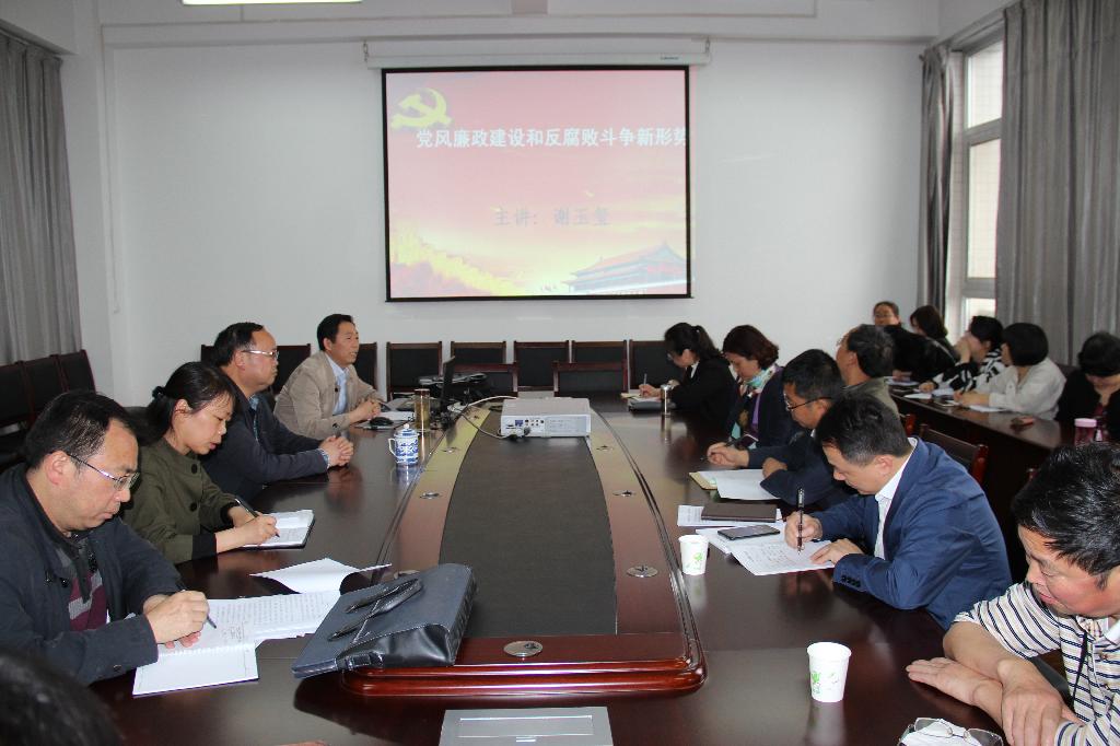 谢玉玺同志从“党风廉政建设和反腐败斗争的概念及意义”、“正确认识党风廉政建设和反腐败斗争新形势”、“主动适应反腐败新形势的几点建议”等三个方面展开阐释。他结合“中国梦”、“四个全面”等基本内容指出了党风廉政建设的重要意义,通过对“密集‘打虎’全覆盖,中国反腐无禁区”、“零容忍‘拍蝇’不手软,清理群众身边的腐败”、“海外‘猎狐’追逃追赃,天罗地网消灭‘避罪天堂 ’”的反腐败斗争解读,让大家认识到中央领导集体巨大的政治勇气和历史担当,加大反腐败斗争力度、严肃查处腐败分子决心和信心。最后,谢玉玺同志结合广大教师的职业身份,解读了《关于建立健全高校师德建设长效机制的意见》,要求广大教师加强学习,提高认识,做到“真学、真懂、真信、真用”,立足岗位,履职尽责。