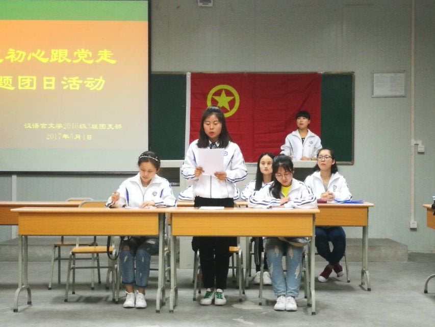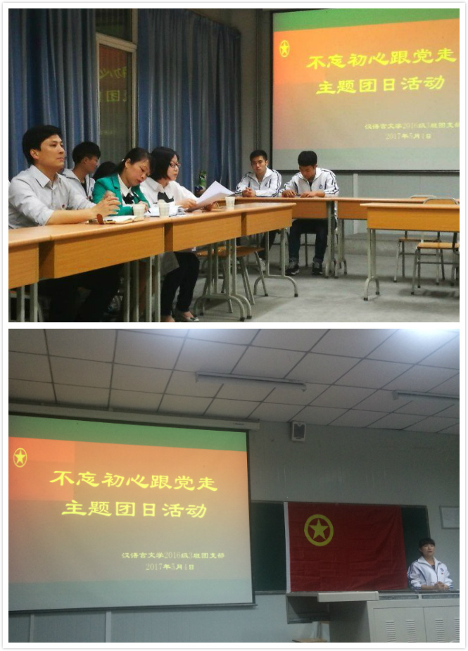 为纪念中国共青团建团95周年和五四运动98周年,学习贯彻习近平总书记在中国政法大学考察时的重要讲话精神,推进落实“一学一做”教育实践活动,澳门网投唯一官网团总支组织汉语言文学2016级3班团支部于2017年5月4日20:00在1016室举办了“不忘初心跟党走”主题团日活动。澳门网投唯一官网团委副书记李光梓、澳门网投唯一官网党总支书记于咏梅、澳门网投唯一官网团总支书记沈菲作为嘉宾参加了本次活动。