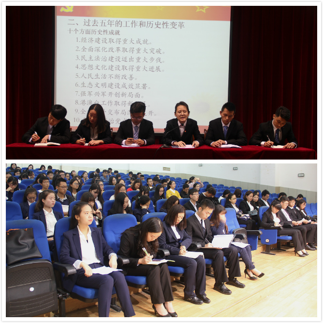 本次会议分为两个部分,分别为十九大报告学习分享会和学生干部工作例会。会议伊始,全体起立齐唱团歌,团总支副书记、学生会主席田乃玉围绕“不忘初心,牢记使命”的主题对十九大报告进行了详细解读,分别从党在过去五年的工作和历史性变革、习近平总书记在十九大上强调的一个重要判断、一个历史使命与四个伟大、习近平新时代中国特色社会主义思想和基本方略、两个重要时期、九个方面理论分析和政策指导六个方面进行具体阐述。最后,她用习近平总书记在十九大上对中国当代大学生的要求作讲话结尾:当代大学生应尊师重教,学会创新,倡导创新文化,坚定理想信念,聚天下之英才,青年兴则国家兴!自觉做共产主义远大理想和中国特色社会主义共同理想的坚定信仰者和忠实实践者。