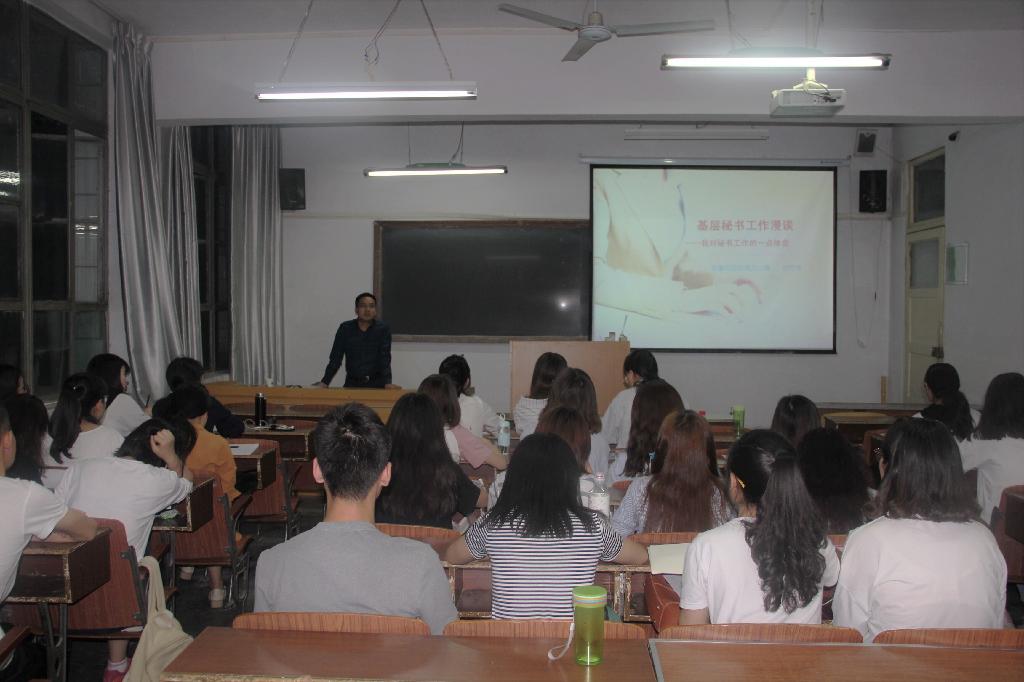 2018年5月3日晚,安康市财政局办公室秘书张宏亮应邀为澳门网投秘书学专业学生做了题为“基层秘书职业与工作漫谈——我对秘书工作的一点体会”的专题讲座。本讲座为秘书学专业职业发展与创新创业教育类课程“行业企业问题讲座”的最后一讲。