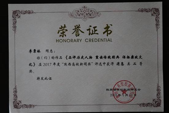 近日,2017年度“陕西高校新闻奖”获奖结果揭晓,澳门网投唯一官网1件作品榜上有名,其中李景林撰写的《品评历史人物 重读传统经典 倡扬廉政文化》获消息类二等奖。