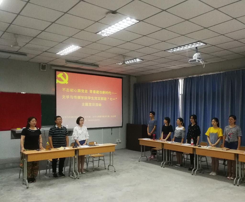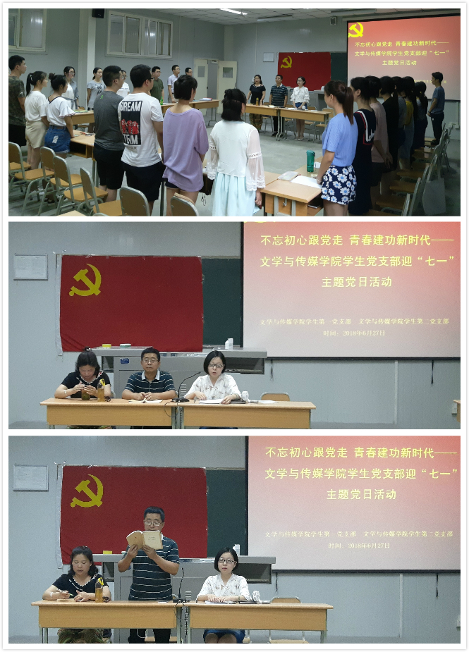 习近平总书记在党的十九大报告上深刻指出中国特色社会主义进入新时代,指出“中国梦是历史的、现实的,也是未来的;是我们这一代的,更是青年一代的。中华民族伟大复兴的中国梦终将在一代代青年的接力奋斗中变为现实”,强调“广大青年要坚定理想信念,志存高远,脚踏实地,勇做时代的弄潮儿,在实现中国梦的生动实践中放飞青春梦想,在为人民利益的不懈奋斗中书写人生华章!”今年是中国共产党建党为97周年,如何引导新时代的广大青年,不忘初心、牢记使命,顽强拼搏、奋勇担当,书写无愧于历史和时代的青春篇章。澳门网投唯一官网学生第一党支部、学生第二党支部于2018年6月27日下午在1017教室联合举办 “不忘初心跟党走,青春建功新时代”——迎七一主题党日活动。澳门网投唯一官网学生第一党支部书记邹棠华、学生第二党支部书记沈菲、辅导员艾全霞,全体学生党员、入党积极分子参加本次活动。本次活动由沈菲主持。