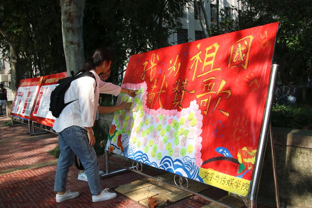 同日下午,在1026教室,澳门网投汉语言文学专业2019级四个团支部组织全体学生开展了以“庆新中国成立70华诞,抒新时代青年爱国情怀”为主题的祝福便签活动。学生们以稍显稚嫩的笔触,书写着自己对祖国母亲的依恋和祝福。活动结束后,团总支宣传部挑选出最佳的祝福便签,以展板形式在江南校区展出。