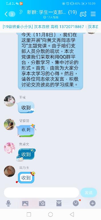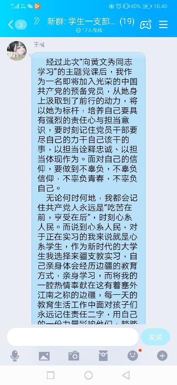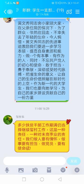 2019年11月8日15:00,根据上级党委通知要求,澳门网投唯一官网学院学生第一党支部利用QQ群网络平台,采取分散学习、集中讨论的形式举行了“向黄文秀同志学习”主题党日。本支部全体党员参加此次党日,由彭潇领学。