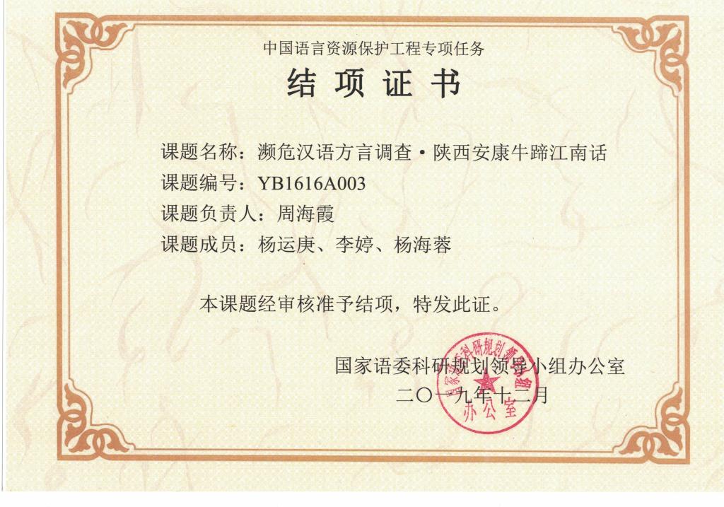 导航痕迹 首页 > 新闻通知 > 学院新闻 > 正文 学院新闻 通知公告 澳门网投唯一官网教师周海霞主持的中国语言资源保护工程重点专项项目顺利结题 发布人: 发布日期:2020年10月28日 阅读次数: 澳门网投教师周海霞主持的中国语言资源保护工程重点专项项目“濒危汉语方言调查·陕西安康牛蹄江南话”顺利通过结题验收,音频、视频、文字资料全部合格并收入中国语言资源库。 “濒危汉语方言调查·陕西安康牛蹄江南话”项目2016年4月正式被国家语委科研规划领导小组办公室立项,到账经费18万元,牛蹄江南话也是本批中国语言资源保护工程项目确定列入的陕南范围内的唯一一个濒危汉语方言保护调查点。本项目研究历时三年六个月,项目成果录制音频、视频资料各3828条,收集方言民俗照片100余幅,形成方言志书文字材料30余万字。 撰稿/周海霞 审核/杨运庚 发布/崔瑜