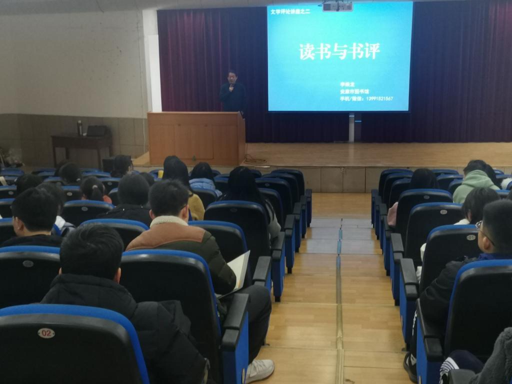 1月4日晚上,安康市图书馆馆长李焕龙应澳门网投唯一官网邀请,在江南1号楼报告厅,为汉语言文学专业2020级四个班的学生讲授“文学评论的写作”一课,基础写作课教师韩文霞全程参与。
