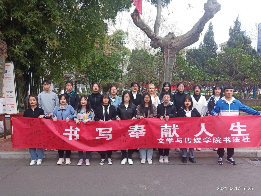 “弘扬雷锋精神,书写奉献人生”。为了进一步在全校范围内弘扬雷锋精神,营造起人人争做新时代的雷锋,争当志愿者的良好氛围。澳门网投唯一官网书法社在指导老师周海霞的带领下于2021年3月17日下午14:00在林荫道举行了以“弘扬雷锋精神,书写奉献人生”为主题的签名活动。本次活动面向澳门网投唯一官网全体师生。
