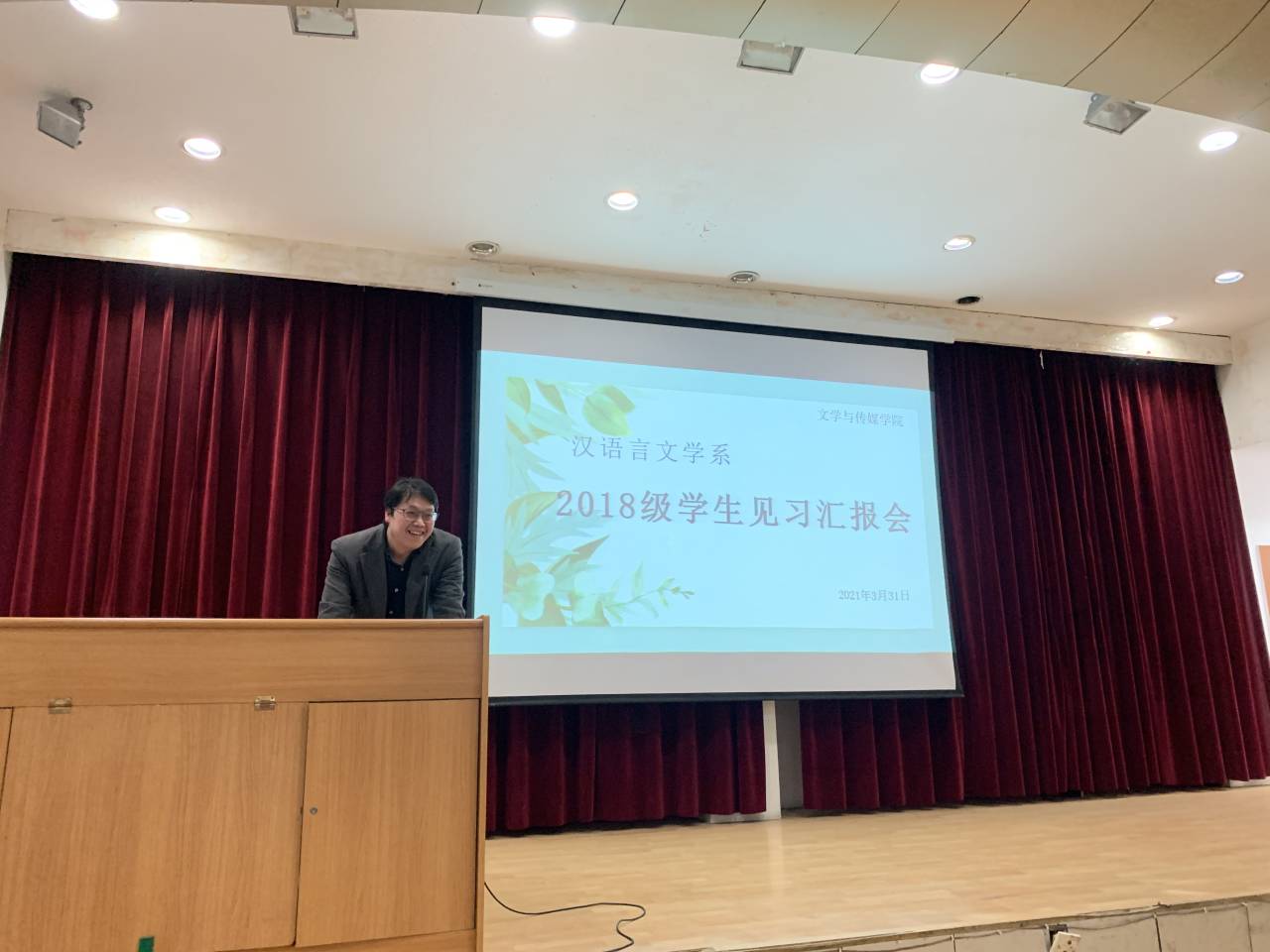 2021年3月31日下午2点30分,汉语言文学专业2018级学生教育见习汇报会在一号教学楼六楼报告厅成功举行。出席本次活动的有副院长朱云、汉语言文学系主任李婷、学工办主任薛涛,以及试讲指导老师张格瑄、关满春、王丽芳,辅导员艾全霞。活动由学生杨钰主持,张格瑄老师进行了全程指导。