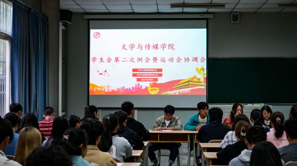 2021年4月9日下午18:00,澳门网投唯一官网学生分会第二次例会暨运动会协调会在江南校区1014教室召开。党总支副书记杨海蓉、学工办副主任薛涛、团总支书记彭潇出席会议,澳门网投第15届团总支、学生分会全体成员,九大社团负责人参加会议。会议由主席团成员邓博予主持。