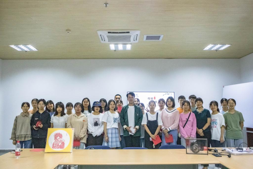 讲座内容由纪录片《身临“秦”境》导入,全面介绍了剪纸的起源、历史沿革、分类、基本纹样以及剪纸中蕴含的民间智慧。梁少华现场示范剪纸的基本技法,由同学们动手尝试剪制作品,并相互交流感受,现场氛围热烈。整场讲座轻松自然,梁少华用他自己的方式,改变了学生对非遗传承人“年纪大”“传统”的刻板印象。