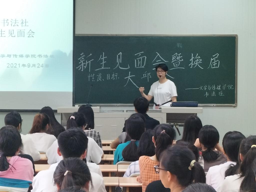 彰显笔墨风采,传承书香文化。澳门网投唯一官网书法社于2021年9月24日16:40在1028教室成功举办了第八届换届暨纳新仪式见面会。参加见面会的有书法社指导老师周海霞老师,前任社长王思蓉,现任社长马子涵以及103位社团成员。