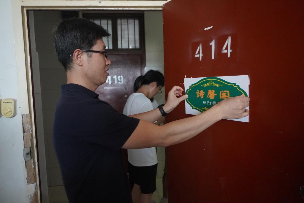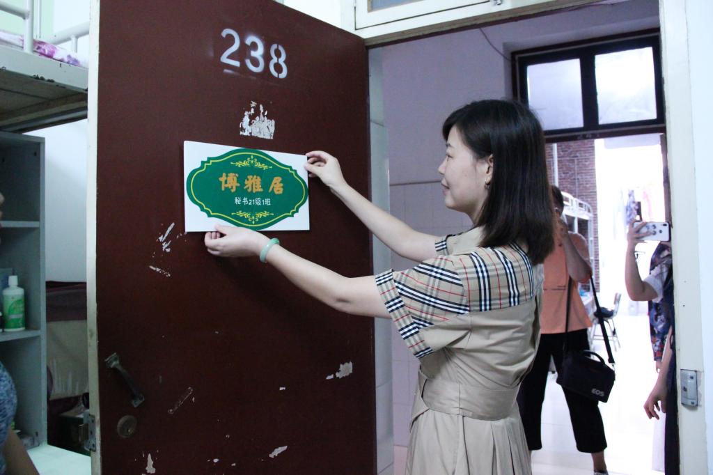 芦伟宣布澳门网投唯一官网第三届宿舍风采大赛正式启动。出席启动仪式嘉宾为2021级新生宿舍授予了雅室门牌,并前往学生宿舍张贴门牌和党员先锋示范岗门牌。