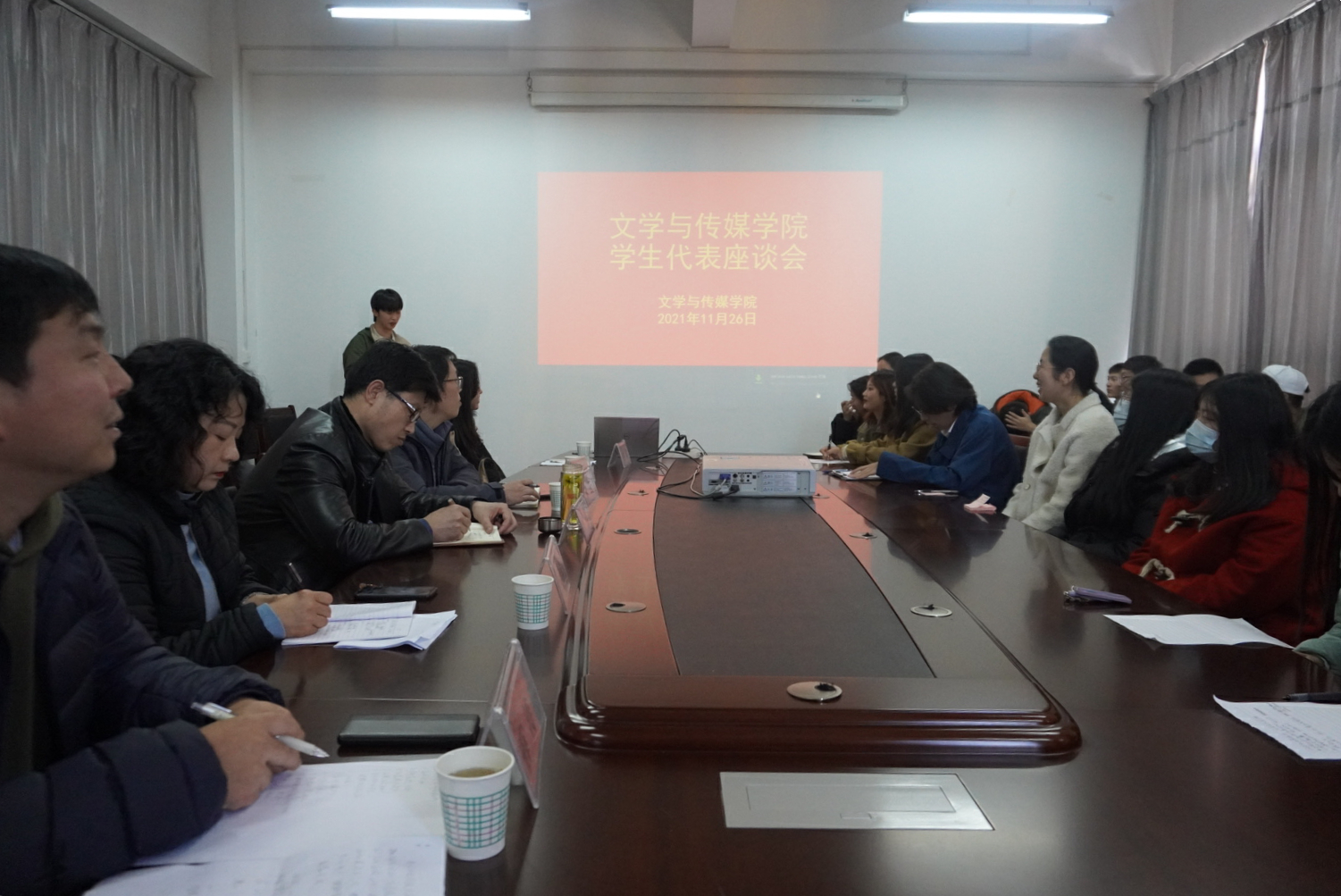 2021年11月26日下午,澳门网投唯一官网在图书馆六楼陕南民间文化研究中心召开学院学生代表座谈会。澳门网投唯一官网党总支书记芦伟、党总支副书记杨海蓉、副院长朱云、学工办副主任薛涛、团总支书记彭潇、辅导员艾全霞以及学院各班学生代表参加会议。会议由薛涛主持。