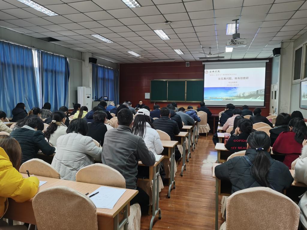 11月26日下午,我校“树初心显担当”教科研系列分享会第三场在江南校区1018会议室开讲,澳门网投唯一官网院长杨运庚教授以“发现真问题,做有效教研”为题就教学改革与教学成果凝练做了专题报告会,相关课题负责人、部分教学院长及无课教师近80人参加。