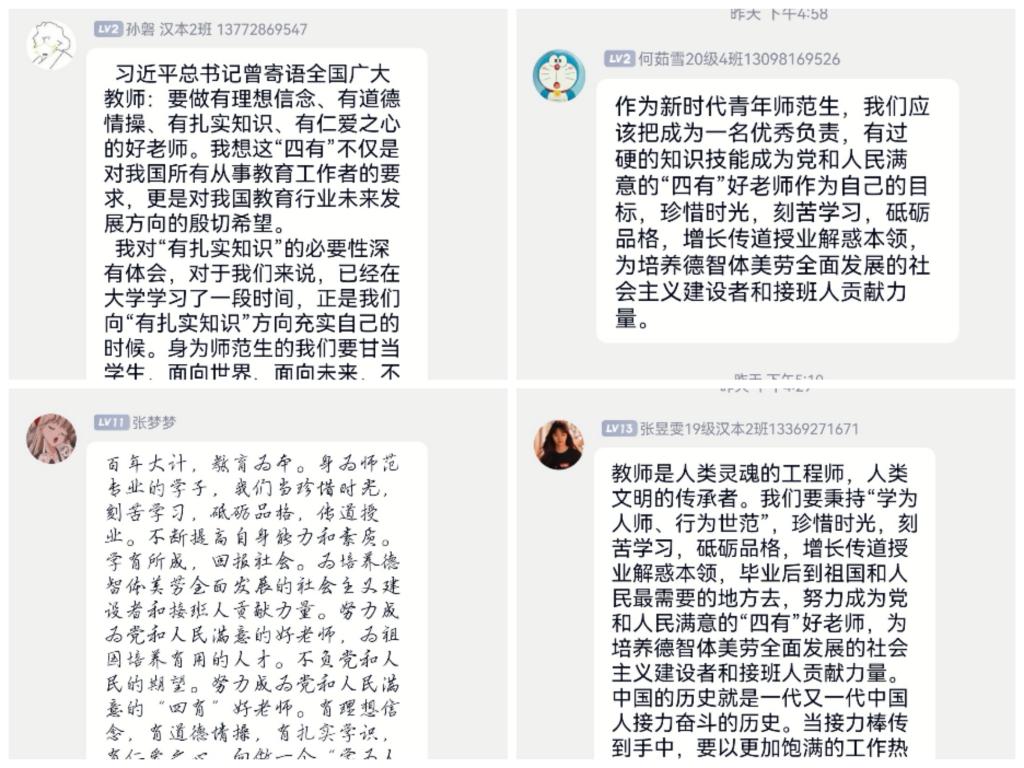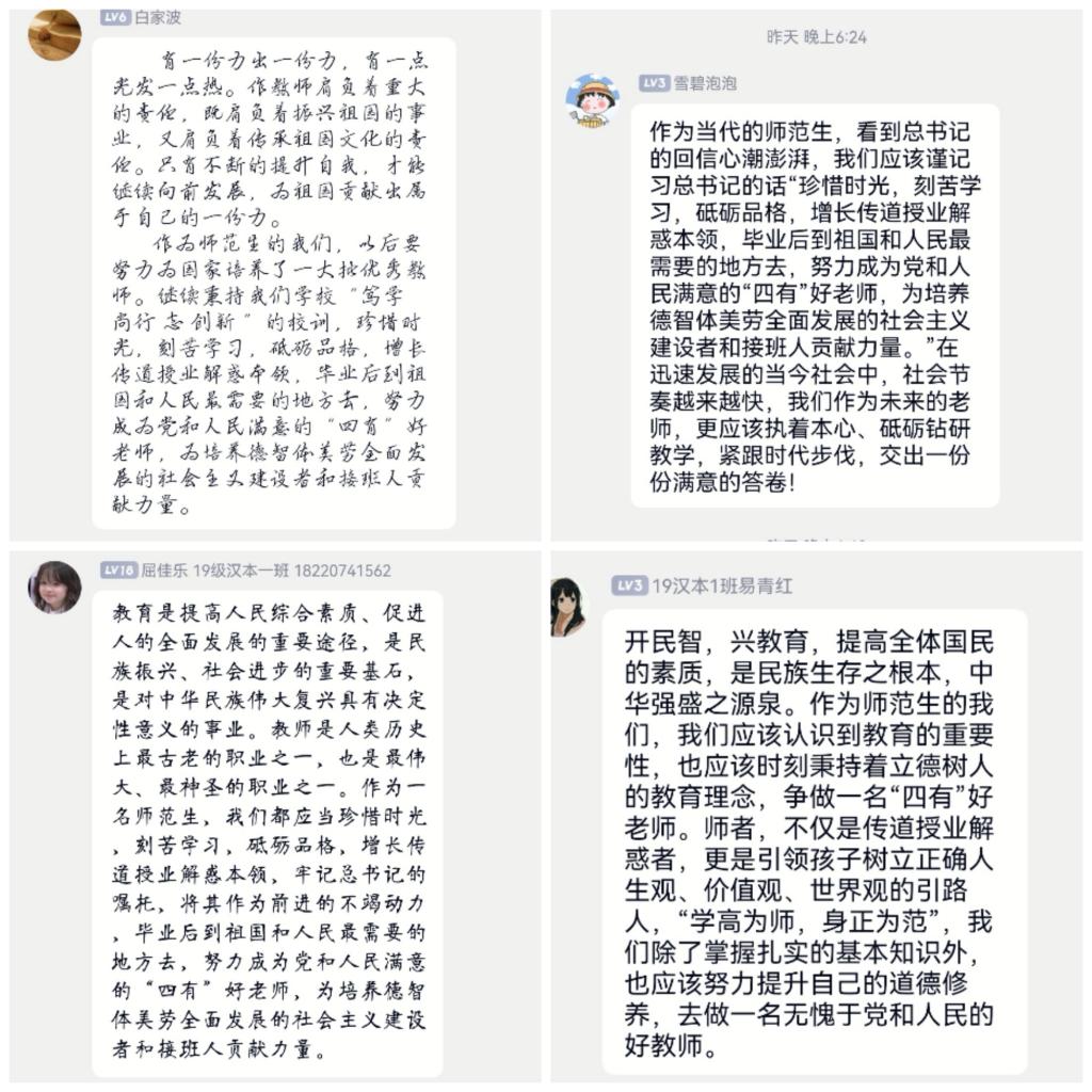 习近平总书记的回信,充分体现党和国家对祖国教育事业的关心,对师范生的殷切期望。教育是国之大计、党之大计,教师是人类灵魂的工程师,担负着教书育人、传播人类文明、培养合格人才、提高民族素质的重任。澳门网投唯一官网通过线上形式组织汉语言师范生认真学习并热议总书记的回信,分享学习心得体会,大家纷纷表示一定会牢记习近平总书记的殷切嘱托,珍惜国家和学校提供的优质资源,坚定师范报国志向,在教学实践中增长才干、砥砺品质,让青春之花绽放在祖国和人民最需要的地方。