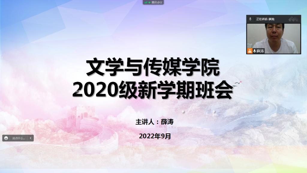 2020级辅导员辅导员薛涛分别从新学期大家状态调整、疫情防控、防范电信诈骗、文明上网等方面进行宣传引导,对《澳门网投唯一官网“中学语文卓越师资班”人才培养计划行动方案(试行)》文件进行解读,解答教师资格证报名考试相关问题,并就线上教学向全体同学提出纪律要求。