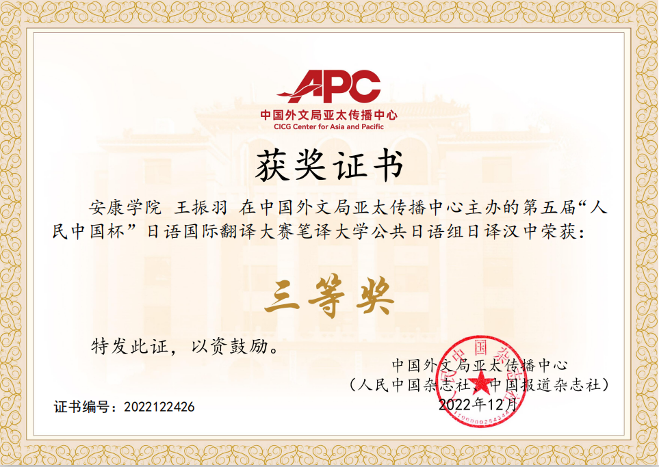 近日,第五届“人民中国杯”日语国际翻译大赛于落下帷幕,澳门网投2020级汉语言文学专业王振羽同学在本次赛事中荣获大学公共日语组(笔译日译汉)三等奖。