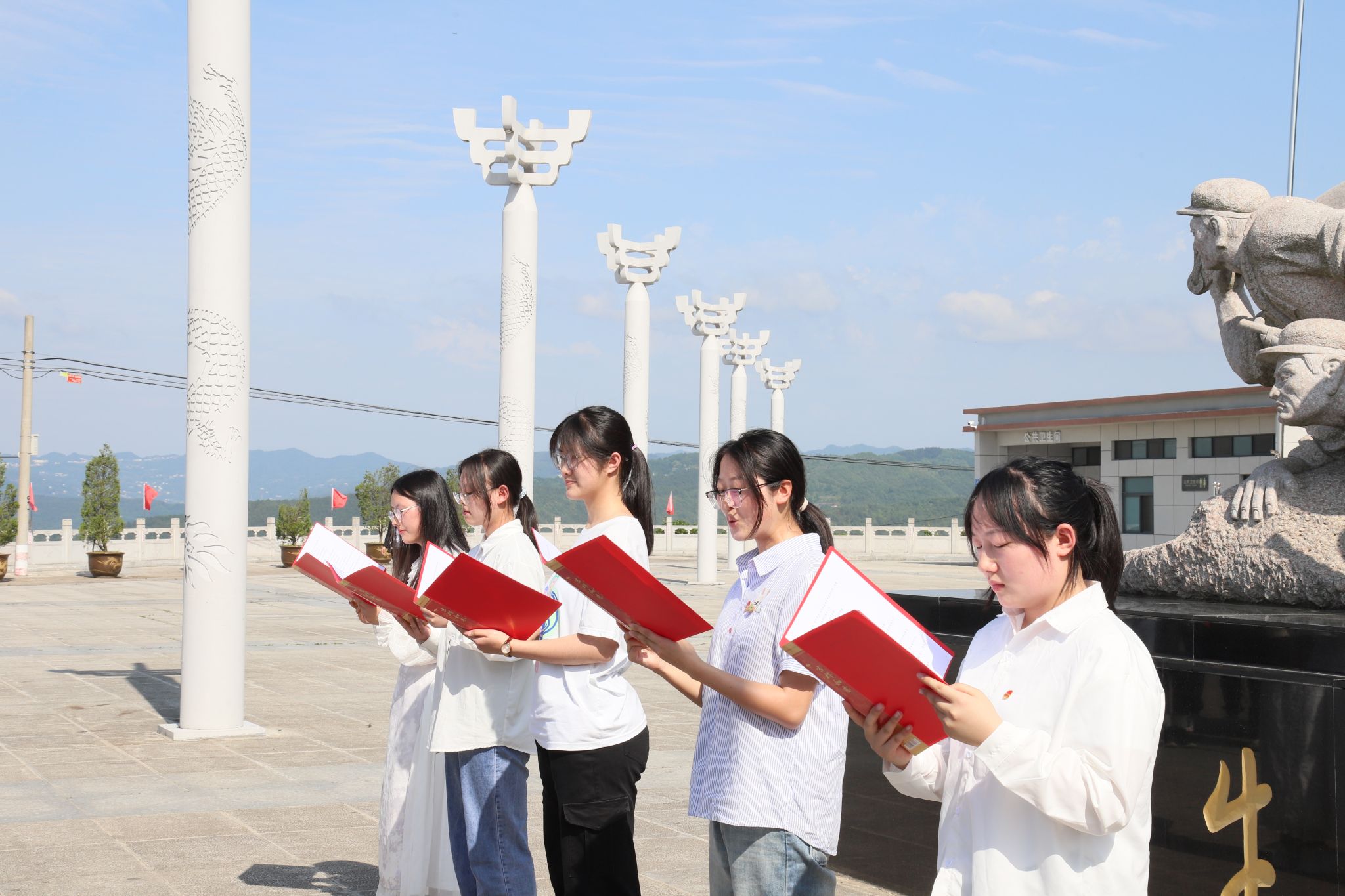到达牛蹄岭后,团员们共同瞻仰牛蹄岭战斗纪念碑,全体肃立,向烈士默哀,为他们献上花篮,缅怀先烈的丰功伟绩和崇高精神,表达深切悼念和无限敬仰,并在领词人的带领下全体成员重温入团誓词。接着,讲解员向大家生动讲述了牛蹄岭战役的过程,带领同学们重温战火纷飞、艰苦奋斗的年代,体会革命战争时期的艰苦和革命烈士不屈不挠的精神。最后,全体成员前往革命纪念广场进行了文艺汇演。