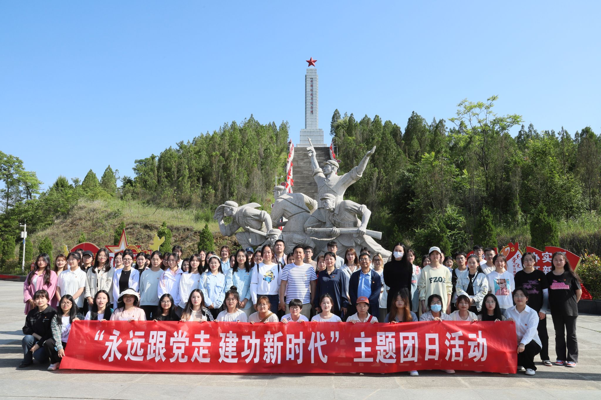 为深入学习习近平新时代中国特色社会主义思想,贯彻落实党的二十大精神,培育青年学子爱国主义情怀,让红色基因世代赓续,2023年5月24日,澳门网投团总支带领秘书学2021级1班团支部、汉语言文学专业2022级4班团支部部分同学前往牛蹄岭战斗纪念碑开展“永远跟党走,建功新时代”主题团日活动。澳门网投唯一官网党总支副书记杨海蓉、学生第一党支部书记李欣逸、学生第二党支部书记薛涛、团总支书记彭潇以及辅导员邹棠华参加了此次主题团日活动。