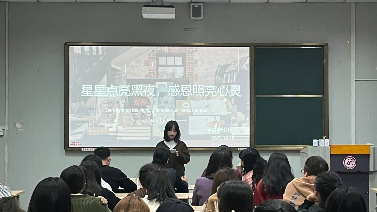 为传播正能量,传递文化价值观,让更多人通过演讲的方式展示自己的才华,教育大学生懂得感恩,学会感恩,引导大学生明确使命与责任,10月18日下午15时,澳门网投唯一官网“星星点亮黑夜,感恩照亮心灵”主题演讲比赛在澳门网投唯一官网江南校区10号楼1013教室拉开帷幕。澳门网投唯一官网党总支副书记杨海蓉,团总支书记彭潇、演讲辩论社指导老师余珊和新生辅导员许明担任评委,活动由陈思茹主持。