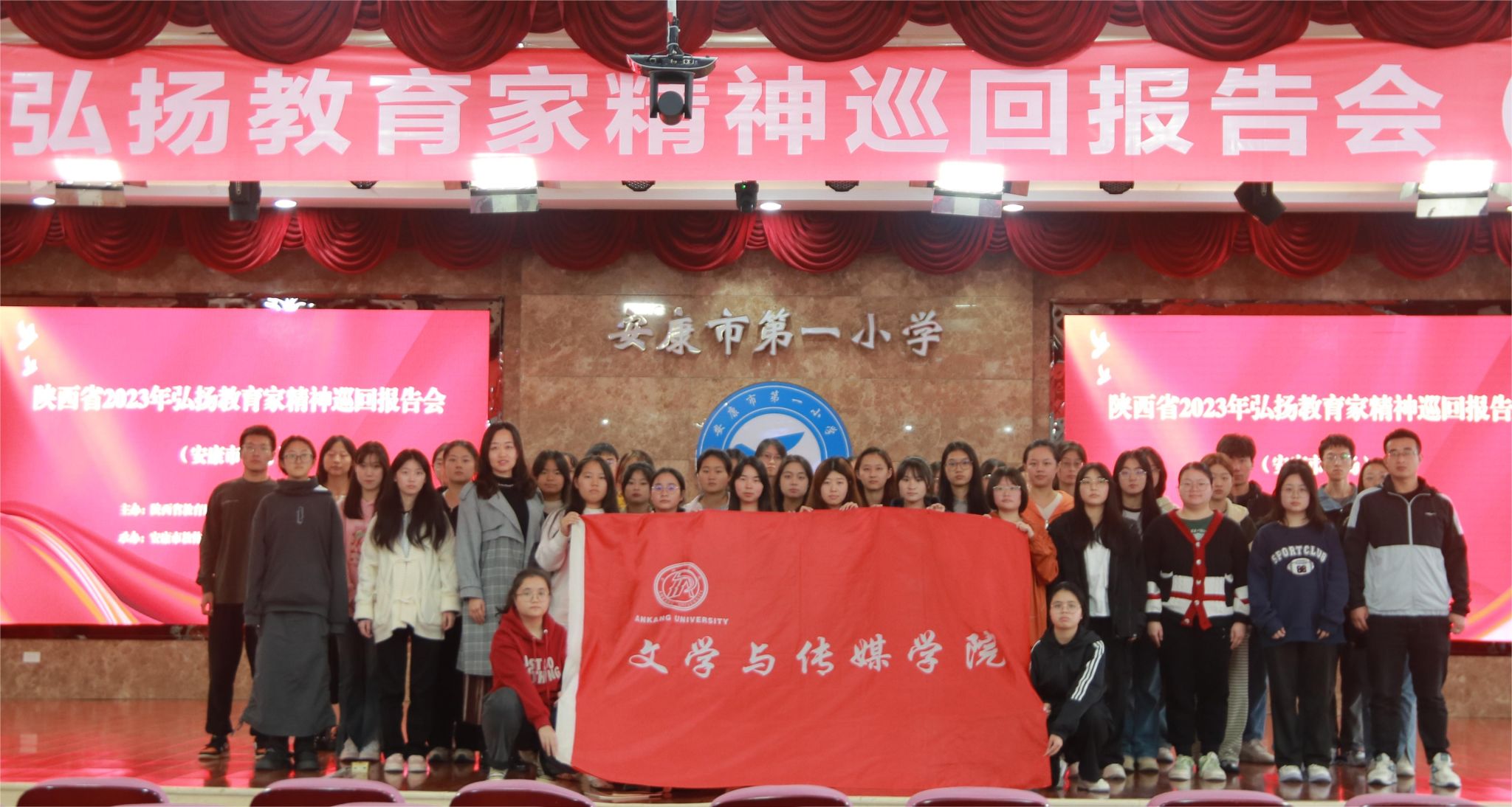 为大力弘扬教育家精神,引导青年学生树立“躬耕教坛、强国有我”的志向和抱负,2023年11月4日上午,澳门网投唯一官网组织学生前往安康市第一小学多功能报告厅,参加陕西省2023年弘扬教育家精神巡回报告会(安康站),开展“引领思想旗帜 铸就坚强核心”主题教育活动。澳门网投唯一官网团总支书记彭潇、辅导员许明和澳门网投部分师范生参与了此次活动。