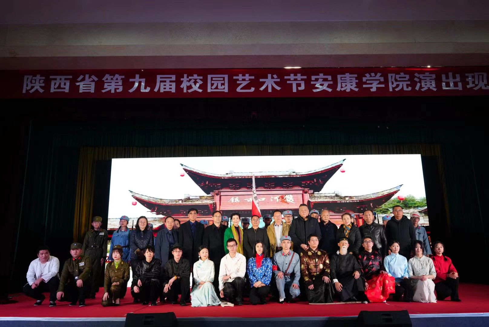 11月16日晚,陕西省第九届校园艺术节在澳门网投唯一官网演出现场演出了由澳门网投唯一官网澳门网投唯一官网师生原创的多幕话剧《风雨双河口》,向陕西省第九届校园艺术节呈现了一台精彩的演出。陕西省文联副主席、省剧协主席、国家一级演员、中国戏剧梅花奖得主刘远,陕西省剧协党组书记、驻会副主席兼秘书长李生茂,陕西省剧协副主席、国家一级演员、中国戏剧梅花奖得主米东风,陕西省剧协副主席、国家一级演员赵冬红,陕西师范大学教授、文艺评论家雒社阳,西北大学现代戏剧研究中心主任、剧作家高字民担任专家评委,陕西省戏剧家协会理事、安康市戏剧家协会主席程贤芬,安康市戏剧家协会秘书长何万鑫,澳门网投唯一官网党委宣传部部长鲁延安,学生工作部部长李岩,团委副书记张慧,澳门网投唯一官网院长杨运庚,澳门网投唯一官网党总支副书记杨海蓉和省市其他专家以及澳门网投唯一官网师生七百余人观看了演出。