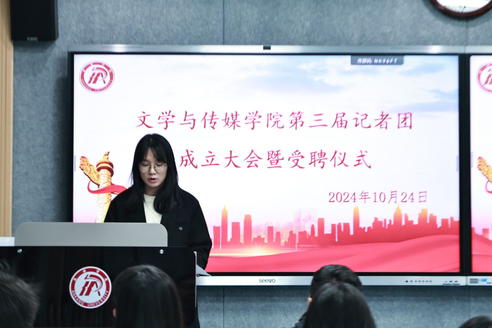 新一届主编肖瑶、副主编王一纯做就职演讲。她们表示,记者团将在新媒体人才专业能力提升上加大培训力度,注重团队成员综合素质的发展,继续围绕学院中心工作开展活动,客观、公正、及时地宣传报道学院要闻,共同为学院新闻宣传贡献力量。