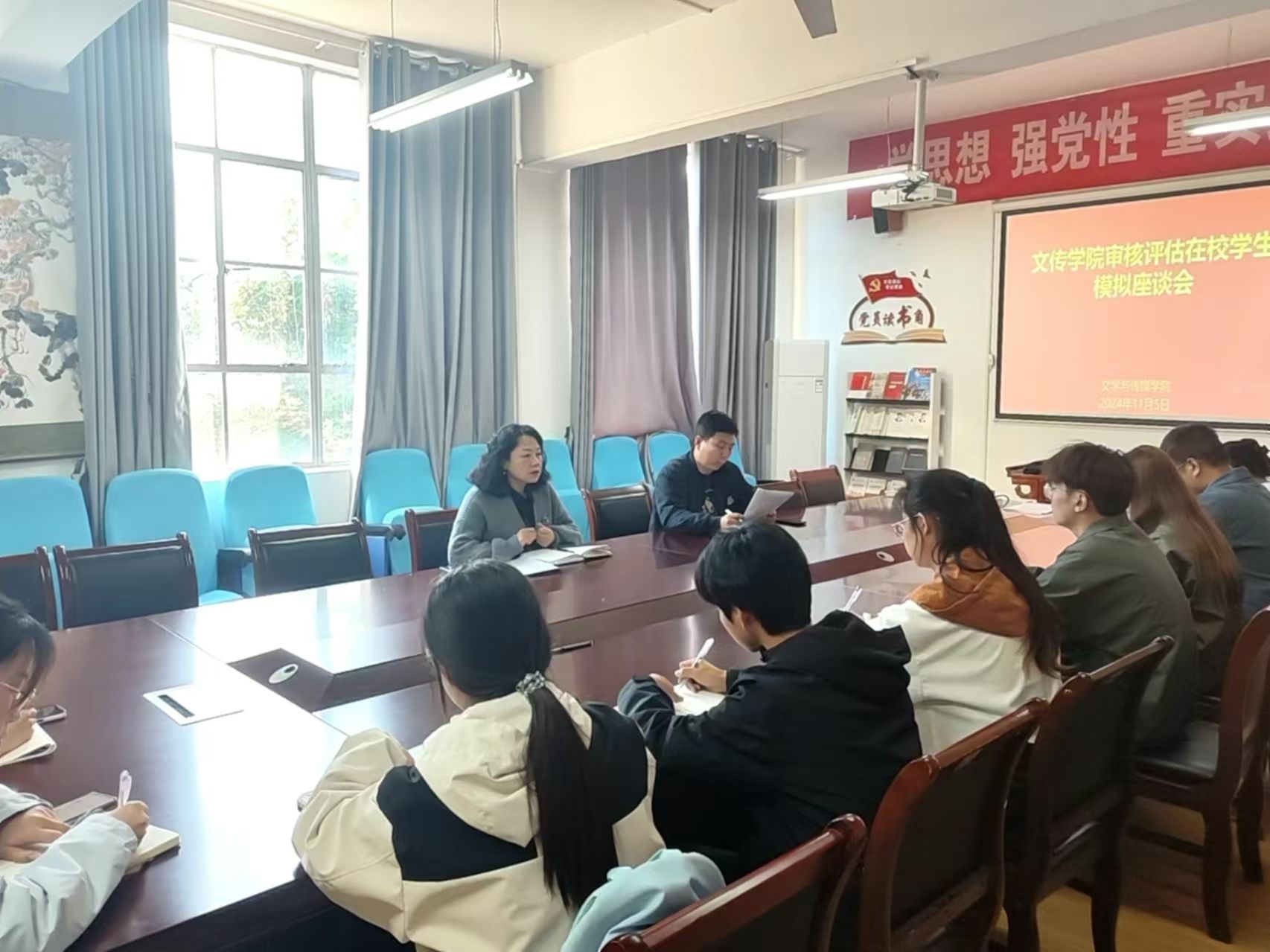 学校本科教育教学审核评估准备工作进入冲刺阶段,为进一步营造良好迎评氛围,加强在校学生对审核评估工作的认知和理解,11月5日下午,澳门网投唯一官网在2307会议室组织开展审核评估在校学生座谈会。学院党总支副书记杨海蓉、学工办主任薛涛及各班学生代表参加本次座谈会。会议由薛涛主持。