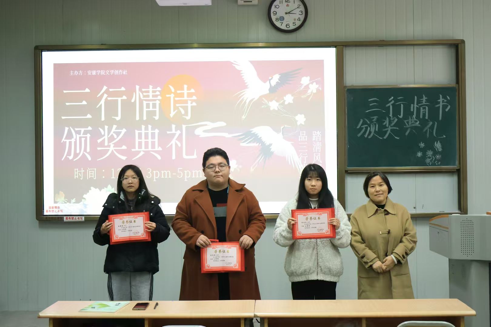 为了激发学生的创作热情,提升学生的文学素养,近期文学创作社举办了“三行情诗”大赛。经过评选,于12月7日下午在江南校区1013教室举行颁奖典礼,社团指导老师韩文霞及社团全体成员和获奖人员参与活动。