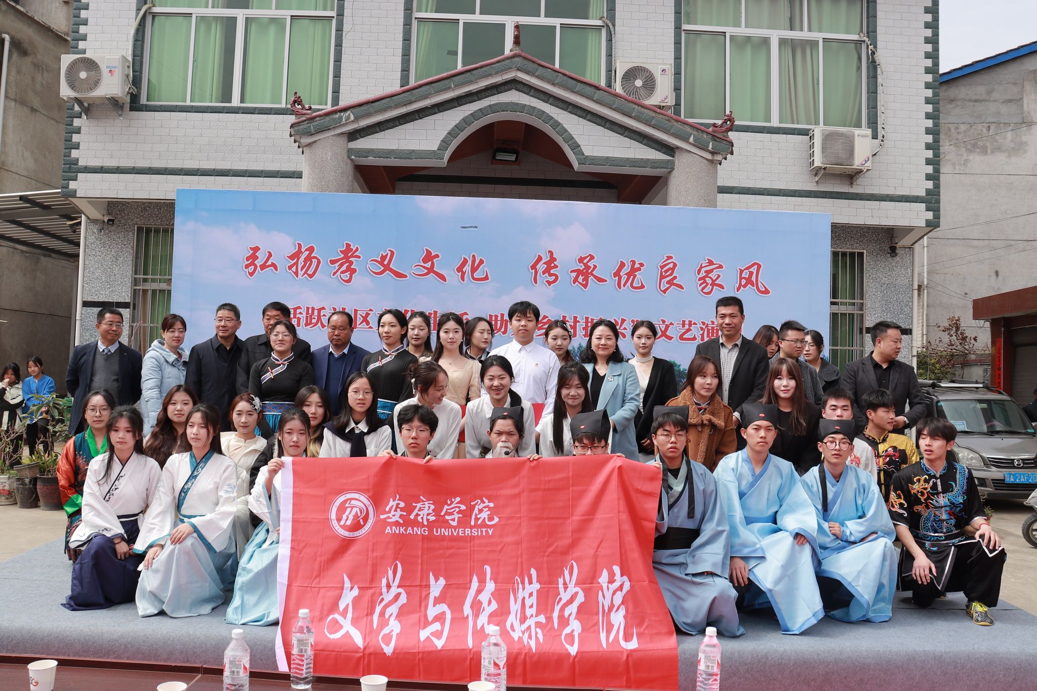 为弘扬孝义文化,培育优良家风,赋能乡村振兴,2025年3月30日,澳门网投师生赴汉阴县双乳镇开展以“弘扬孝义文化,助力乡村振兴”为主题的送文化下乡活动。本次活动由学院辅导员邹棠华老师策划并执导,院党总支副书记杨海蓉、学工办主任薛涛带队,联合体育学院、化学与环境学院、外语学院、教育学院40余名同学,为当地群众献上了一台文化盛宴。本次演出活动得到了汉阴县文联,县家训文化传承研究学会,双乳镇党委、人民政府,双乳镇社区的支持以及汉阴邹氏家训文化传承研究学会的鼎力协助。汉阴县文联主席李轶、县家训文化传承研究学会会长沈继正、双乳镇党委委员程鹏,双乳社区党支部书记高志才以及当地群众三百余人观看了演出。