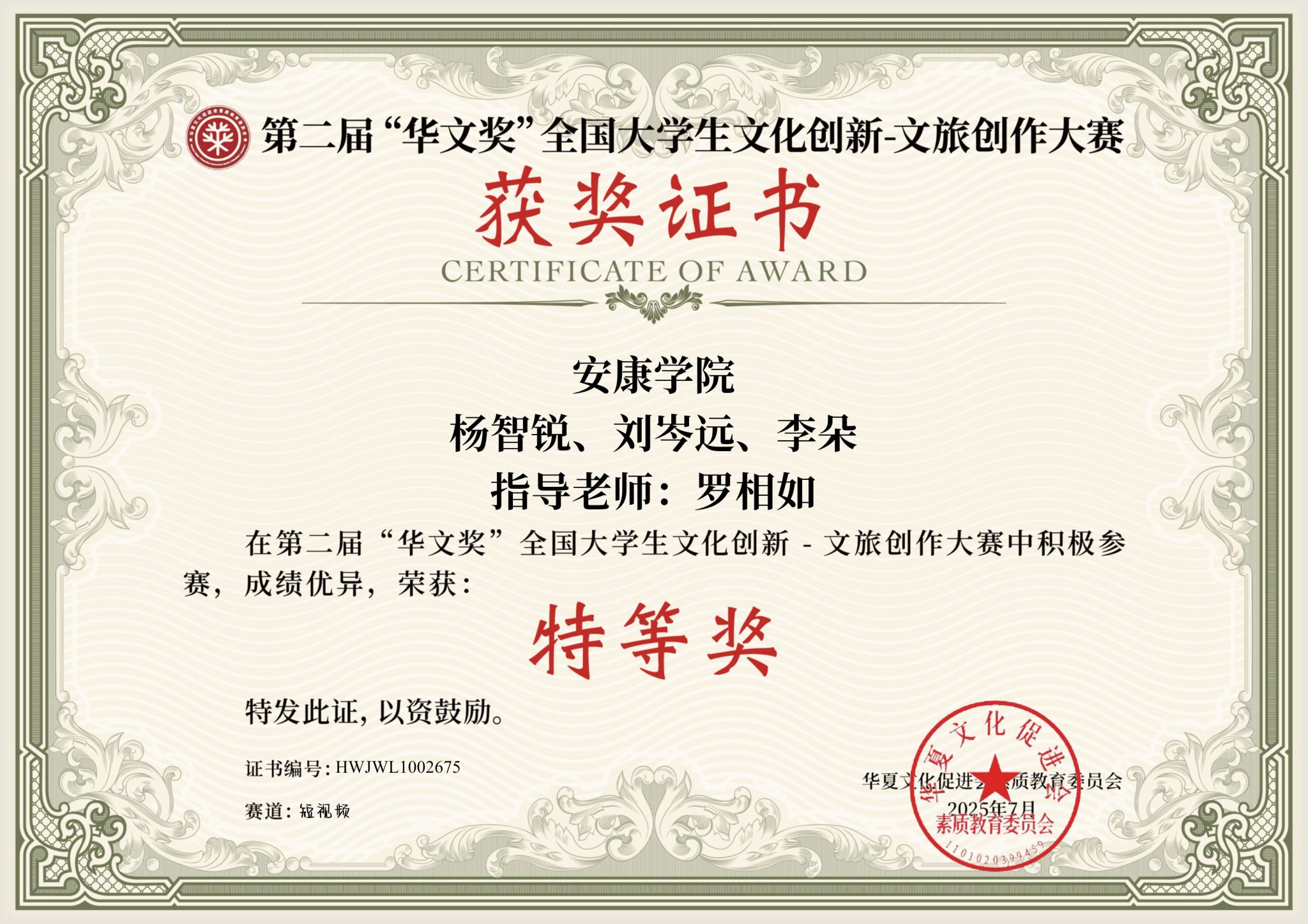 据悉,第二届“华文奖”由华夏文化促进会主办,面向全国高校大学生围绕“家乡之美”主题,鼓励通过短视频、摄影、文案等形式多元展现地方文旅风貌和地域文化底蕴。大赛共设特等奖、一等奖、二等奖和三等奖,其中特等奖为各赛道综合排名前三名。