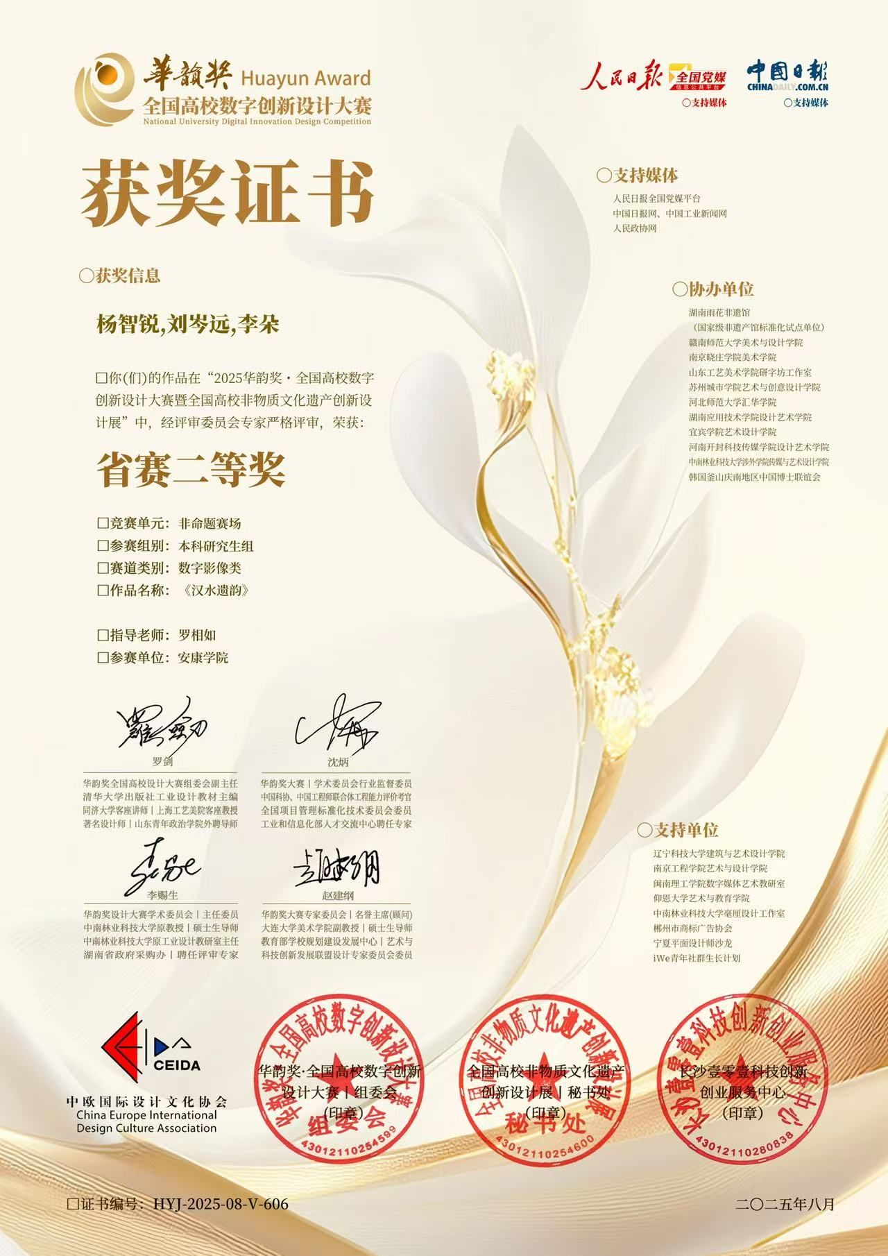 近日,在“华韵奖·全国高校数字创新设计大赛”省级赛区评选中,澳门网投报送的短视频作品《汉水遗韵》在众多参赛作品中脱颖而出,荣获省赛二等奖。这是该作品继获得“华文奖”全国大学生文化创新·文旅创作大赛特等奖后,再次在全国性赛事中取得优异成绩。