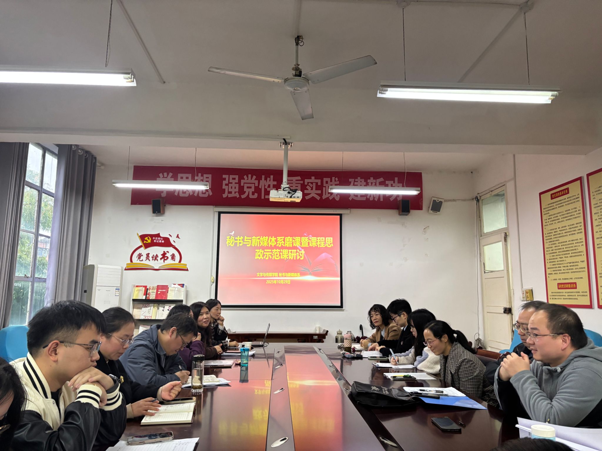 为进一步提升学院教师教学水平,深入推动与促进教师间的学习与合作,同时配合做好教育教学审核评估回头看专家进校考察准备工作,2025年10月29日,秘书与新媒体系举办了磨课暨课程思政示范课研讨活动。本次活动由秘书与新媒体系主任邸玲负责组织实施,崔瑜老师进行示范课教学,学院领导、校院教学督导、各系主任以及其他无课教师参加了活动。