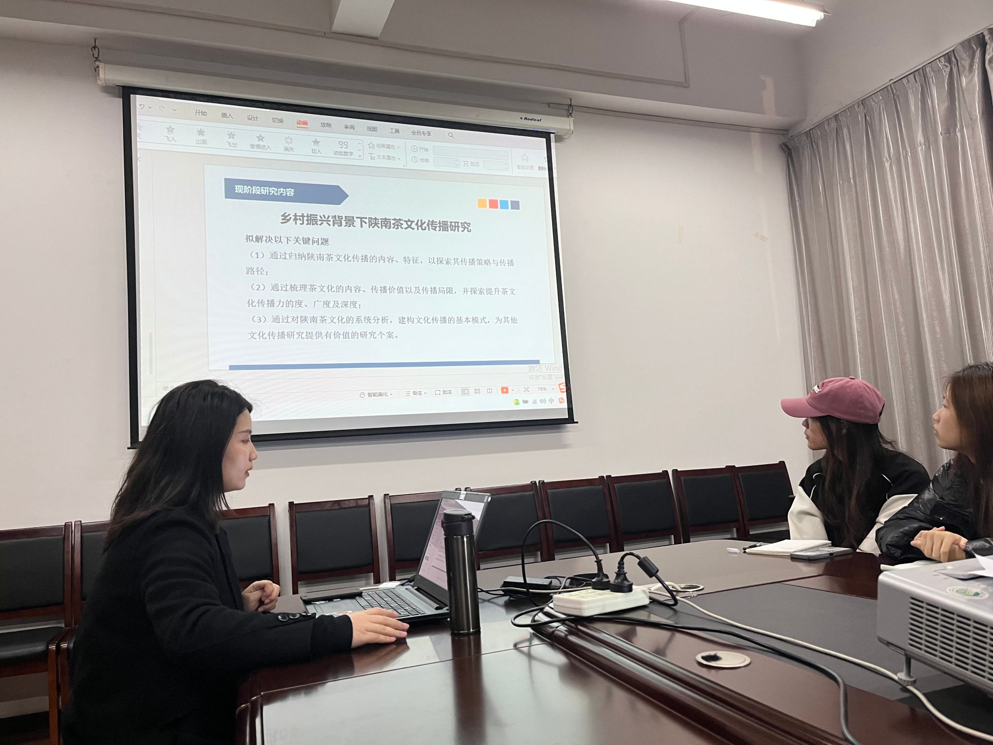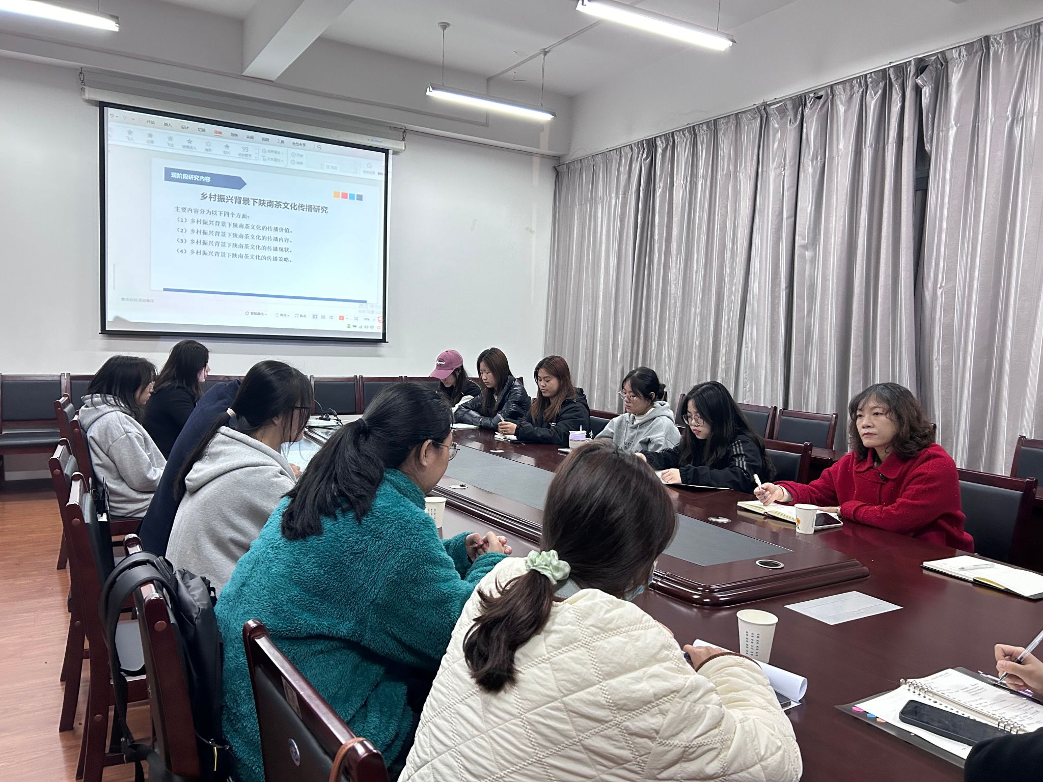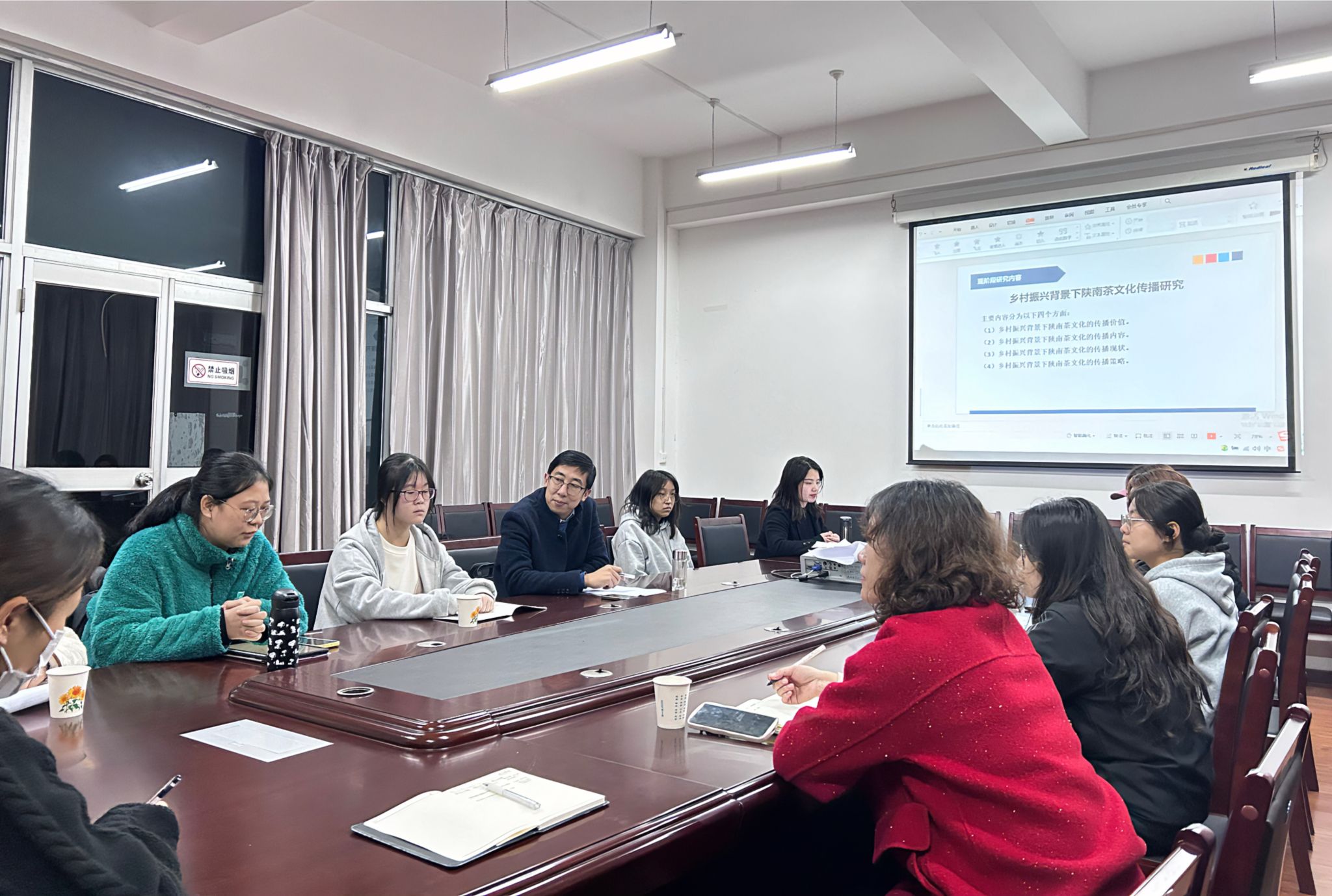 评议人崔瑜老师从一带一路背景下,中国茶文化对外传播策略与发展展开论述。此外,针对乡村振兴背景下陕南文化传播研究选取具有代表性陕南茶文化名片如安康平利茶、紫阳富硒茶等内容进行了案例分析。刘锦老师结合自身近年来的学术研究方向:“新农人”短视频研究进行了相关分享,韩佳颖和何鲁艺两位新进教师结合研究生在读期间的研究方向初步确定自己今后的研究方向,其余到场老师针对以上几位老师的汇报,从不同角度提出具体的建议。参加活动的网媒专业学生也积极向老师提问,各位老师也给与了耐心的回答。